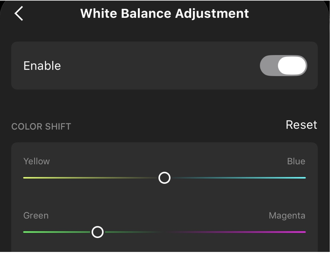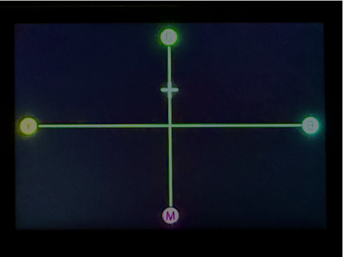 Wenn man die zweite Option auswählt und die erste aktiviert ist, kann man auf der vertikalen Achse zwischen Grün und Magenta und auf der horizontalen Achse zwischen Gelb und Blau wechseln (entsprechend der Option „Farbton” in Lightroom). Man kann den Touchscreen verwenden, um die Schieberegler zu bewegen, und durch doppeltes Antippen wird er wieder zentriert.