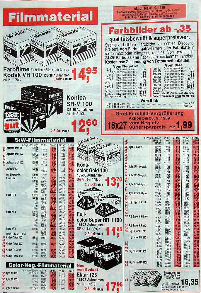 Betrachten wir die Preise der Preislisten aus den hier gezeigten Bildern und rechnen diese Preise auf eine aktuelle Kaufkraft, ist Film mitnichten so teuer, wie oft behauptet wird. Ein 1984 gelisteter Kodak VR 400 Film, der mit einem heutigen UltraMax 400 gleichgesetzt werden kann, kostete damals 8,80DM. Nach heutiger Kaufkraft würde der Film ca. 13€ kosten. Der UltraMax 400 kostet heute (Stand 14. Mai 2024) im hiesigen DM Drogeriemarkt 9,95€. Das Beispiel kann mit anderen Filmen, insbesondere Profifilmen munter fortgesetzt werden. Die Kaufkraft(um)rechnung ist zwar recht hypothetisch, liefert aber einen Wert, der zeigt, dass Film eben nicht teuer ist. Vergessen darf man nicht, das analoge Fotografie in den 1980er und 90er ein Massenmarkt war. Rohstoffe waren günstiger und in viel größeren Mengen beschaffbar. Heute ist die Filmproduktion ein Nischenmarkt, der sehr strengen Umweltschutzauflagen unterliegt. Geringe Mengen, Rohstoffgewinnungsprobleme, Handelskriege, geopolitische Auseinandersetzungen, Inflation und ein kleiner Markt spielen ebenfalls eine sehr große Rolle bei der Preisfindung.