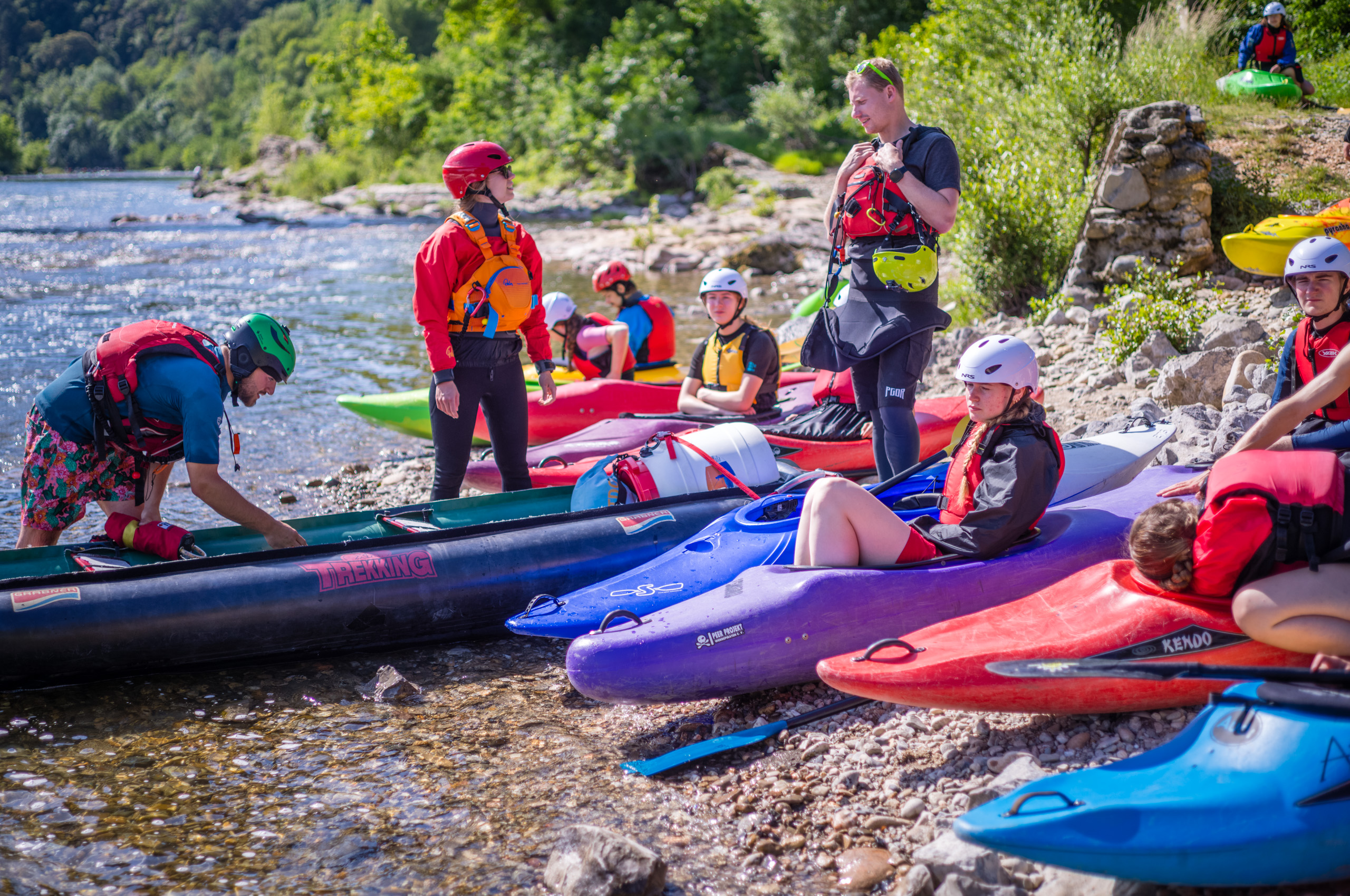 Das Rätsel löst sich, als aus dem Anhänger eine große Zahl an Wildwasser-Kajaks entladen wird: Es handelt sich doch nicht um eine dubiose Sekte, sondern um die jährliche Fahrt der Kanu-AG des Wesergymnasiums Vlotho (kurz WGV) an die Ardèche. Eine Fahrt, die derart kultischen Status hat, dass viele Abgänger des Gymnasiums sich jedes Jahr hier einfinden. Denn das Gymnasium verlässt man zwar, die Kanu-AG aber nie… Die jüngste Teilnehmerin ist 11, der älteste fast 70 und alle verbindet die AG und der Kanu Sport. Die Leitung ist schon in der zweiten Generation, denn das Lehrer-Ehepaar, das die AG in den 70er Jahren gründete und schon damals an die Ardèche fuhr, ist längst im Ruhestand. Ein guter Freund, damals selbst Schüler in der AG, wurde Lehrer und übernahm den Staffelstab im Jahr 2004.