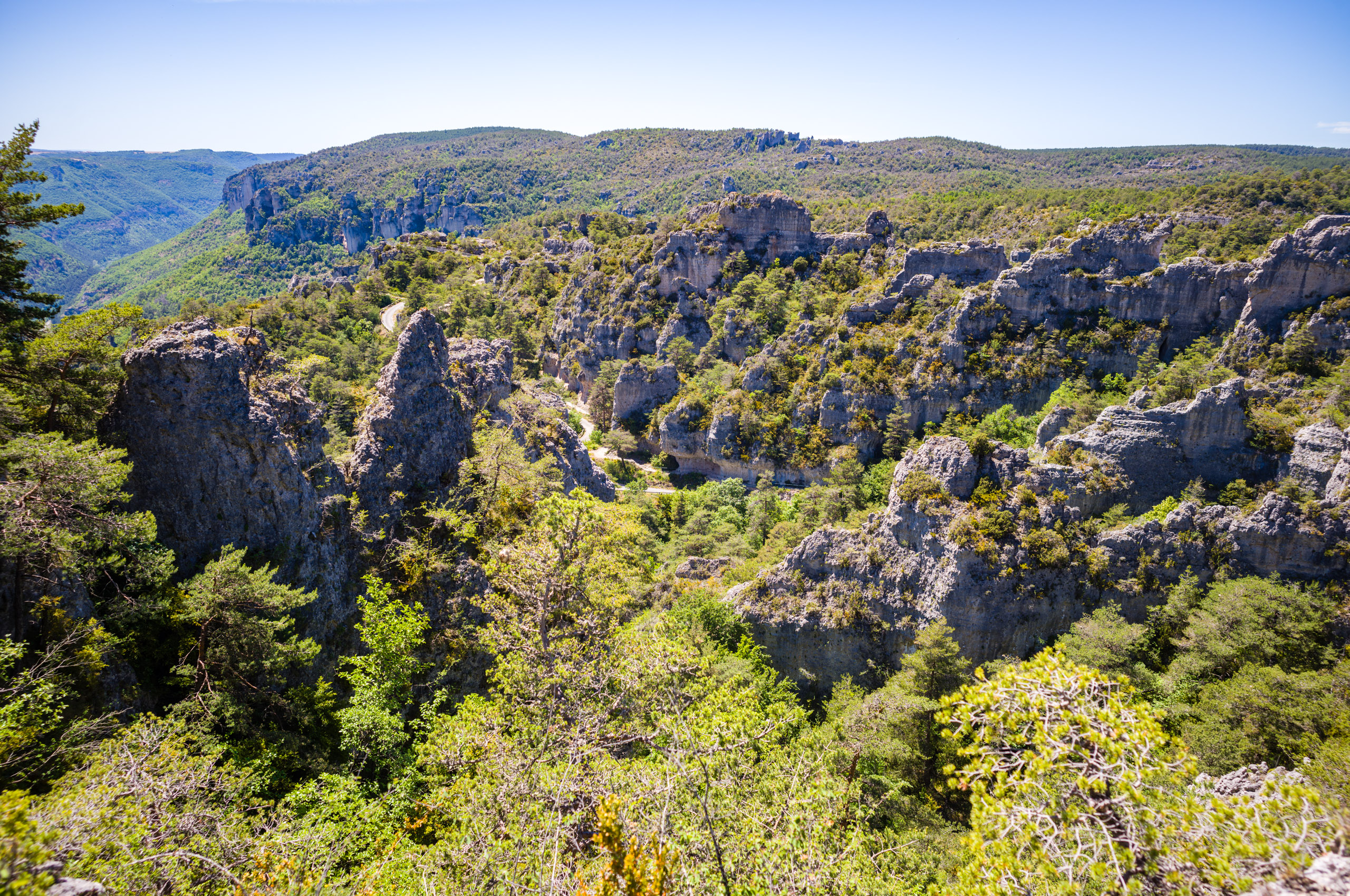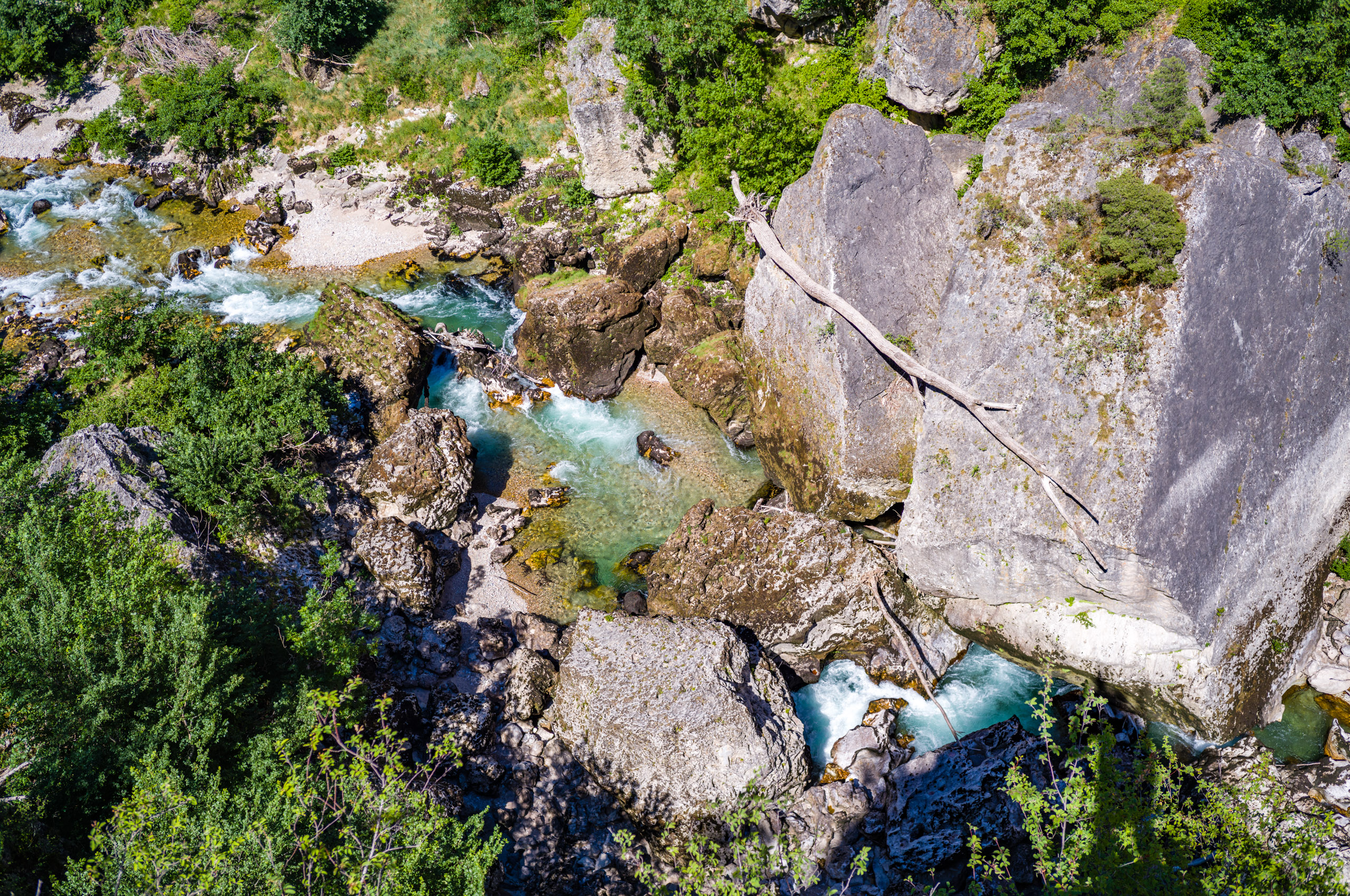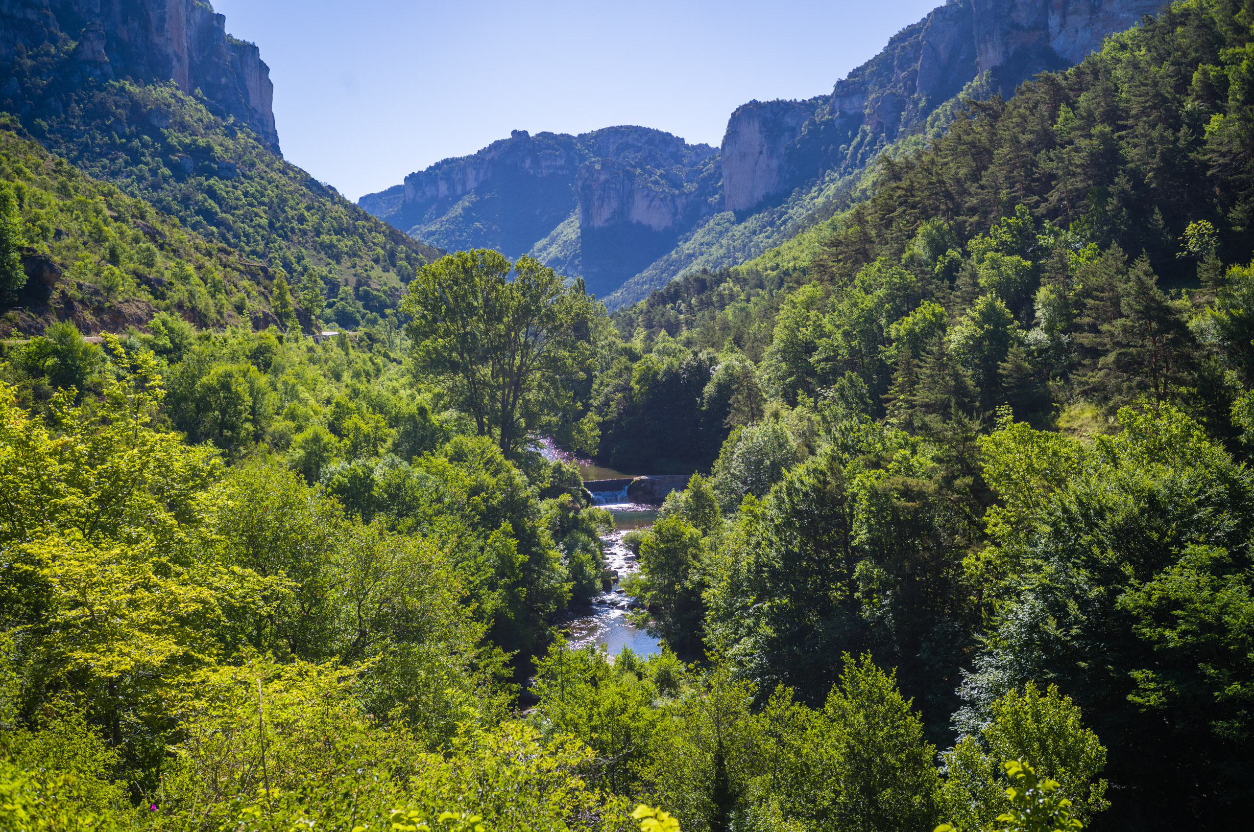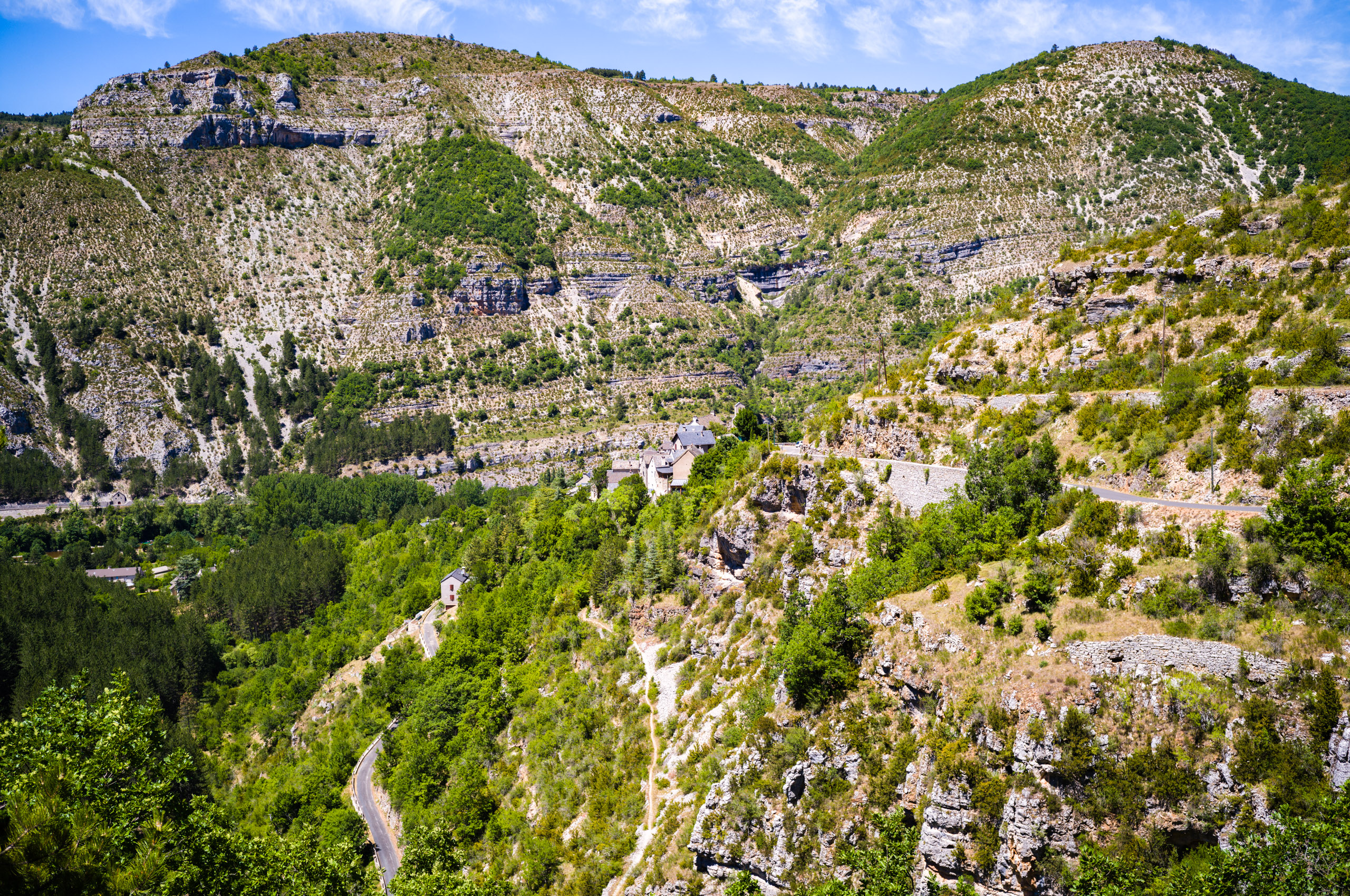 Beim abfahren in die Schlucht blies mir ein heisser Wind entgegen, als hielte ich mein Gesicht in einen Fön. Ich erkannte, dass das Klima im Vergleich zur Schlucht oben auf der Causse wesentlich angenehmer war. Der Wind kam stetig von Westen und brachte keinerlei Kühlung. Ich bog links auf die D907 ab und folgte ihr die gesamte Stecke über Le Rozier bis Aguessac. Die Tarnschlucht abwärts gibt es ein paar interessante Motive.