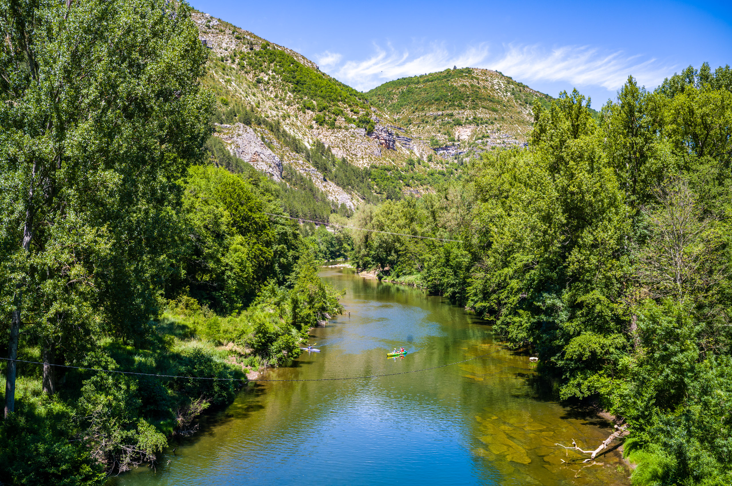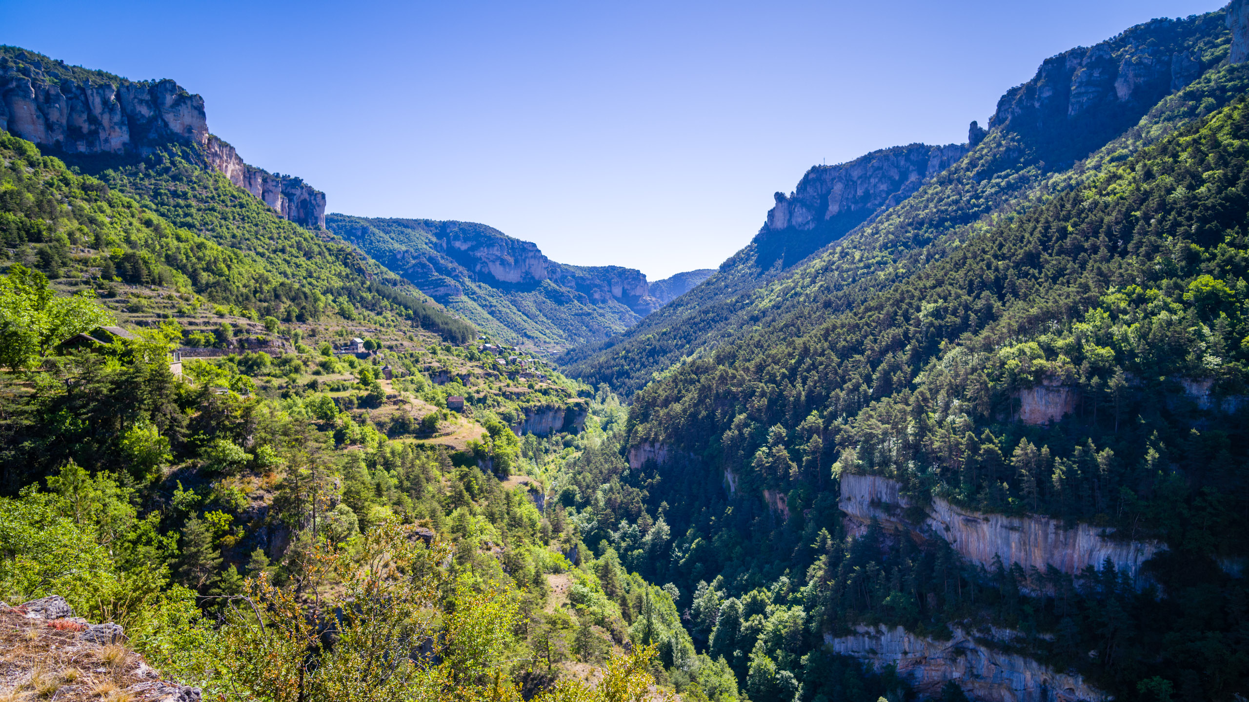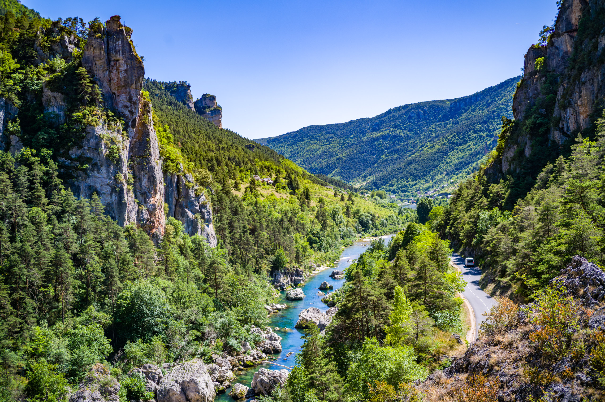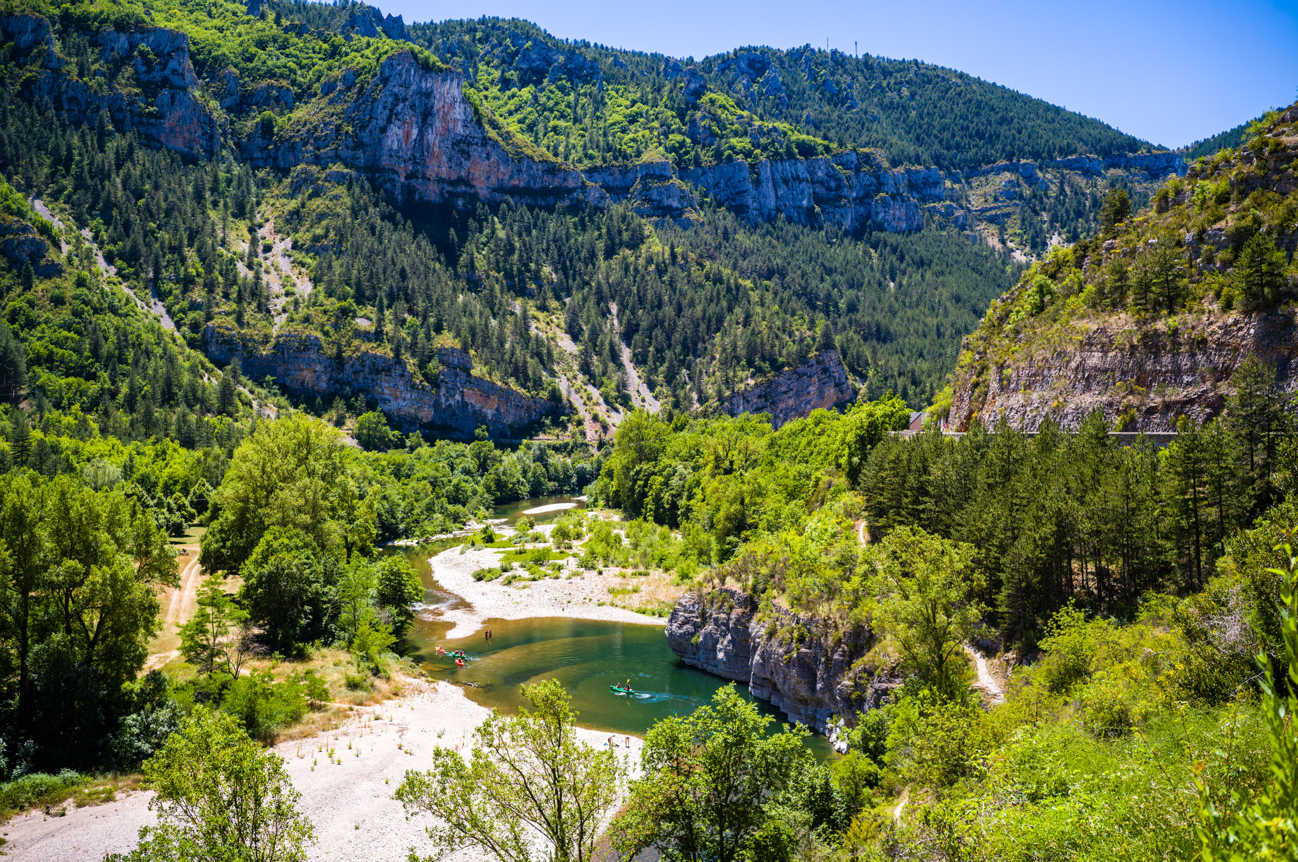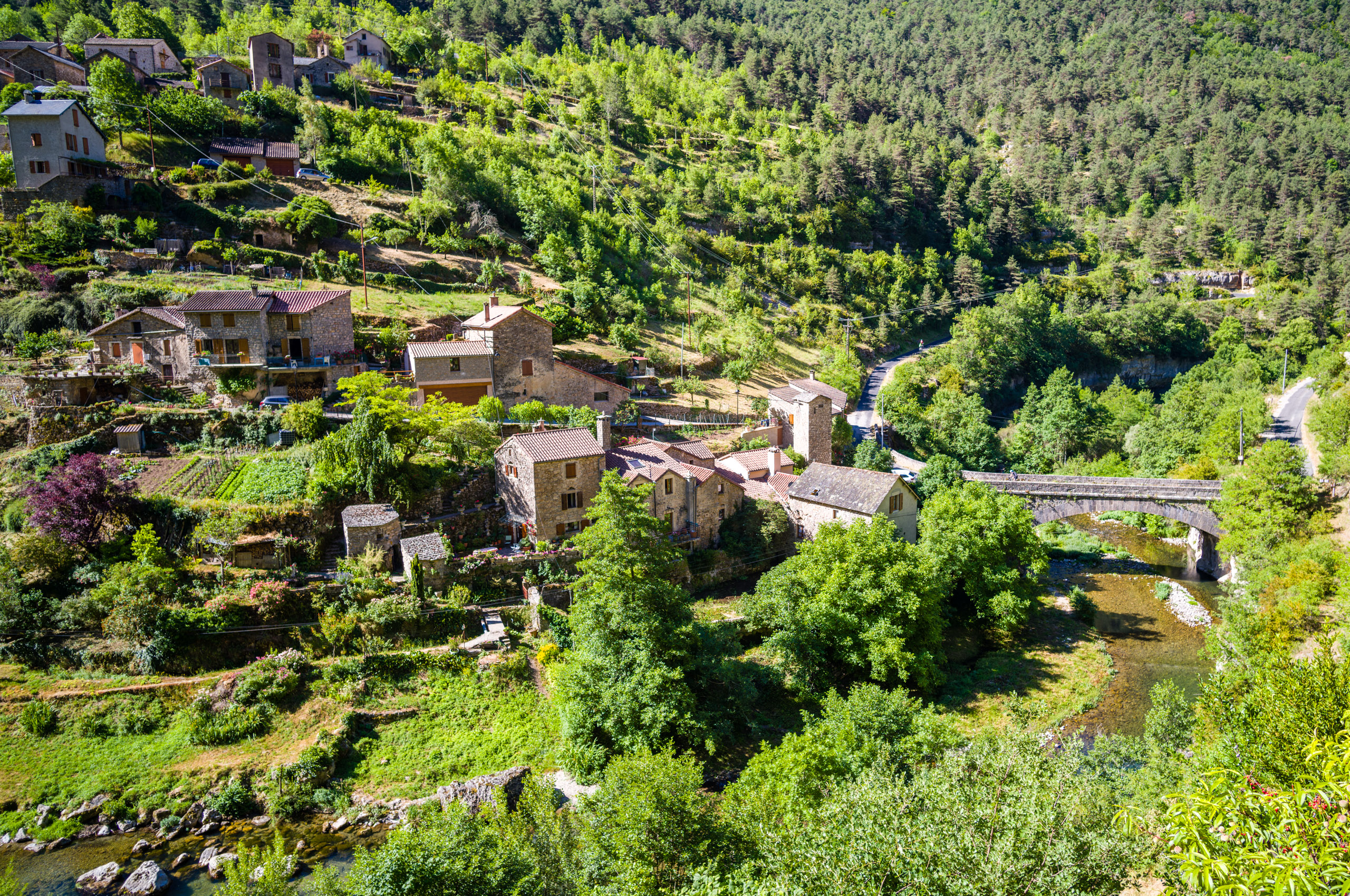 Beim abfahren in die Schlucht blies mir ein heisser Wind entgegen, als hielte ich mein Gesicht in einen Fön. Ich erkannte, dass das Klima im Vergleich zur Schlucht oben auf der Causse wesentlich angenehmer war. Der Wind kam stetig von Westen und brachte keinerlei Kühlung. Ich bog links auf die D907 ab und folgte ihr die gesamte Stecke über Le Rozier bis Aguessac. Die Tarnschlucht abwärts gibt es ein paar interessante Motive.