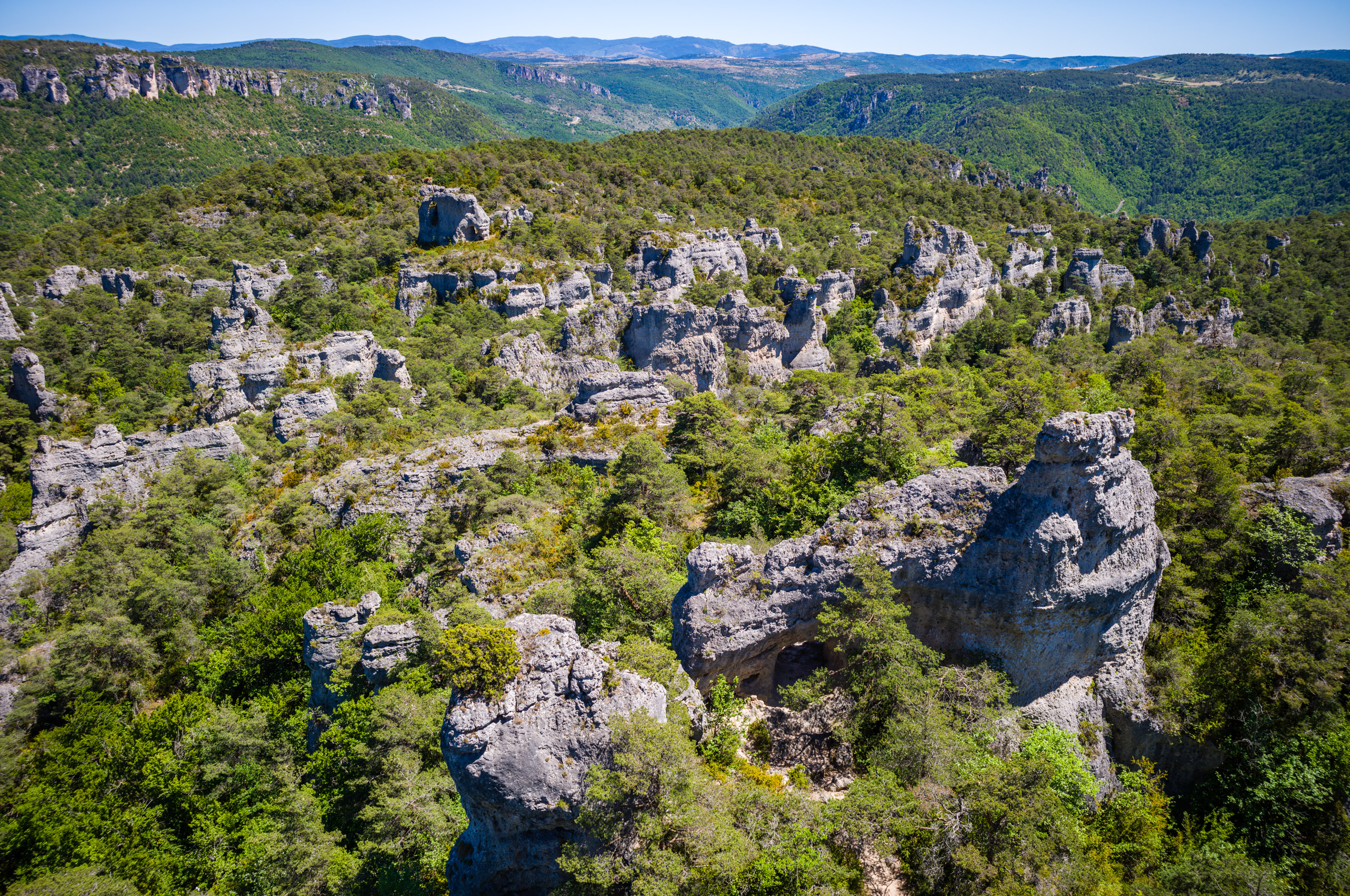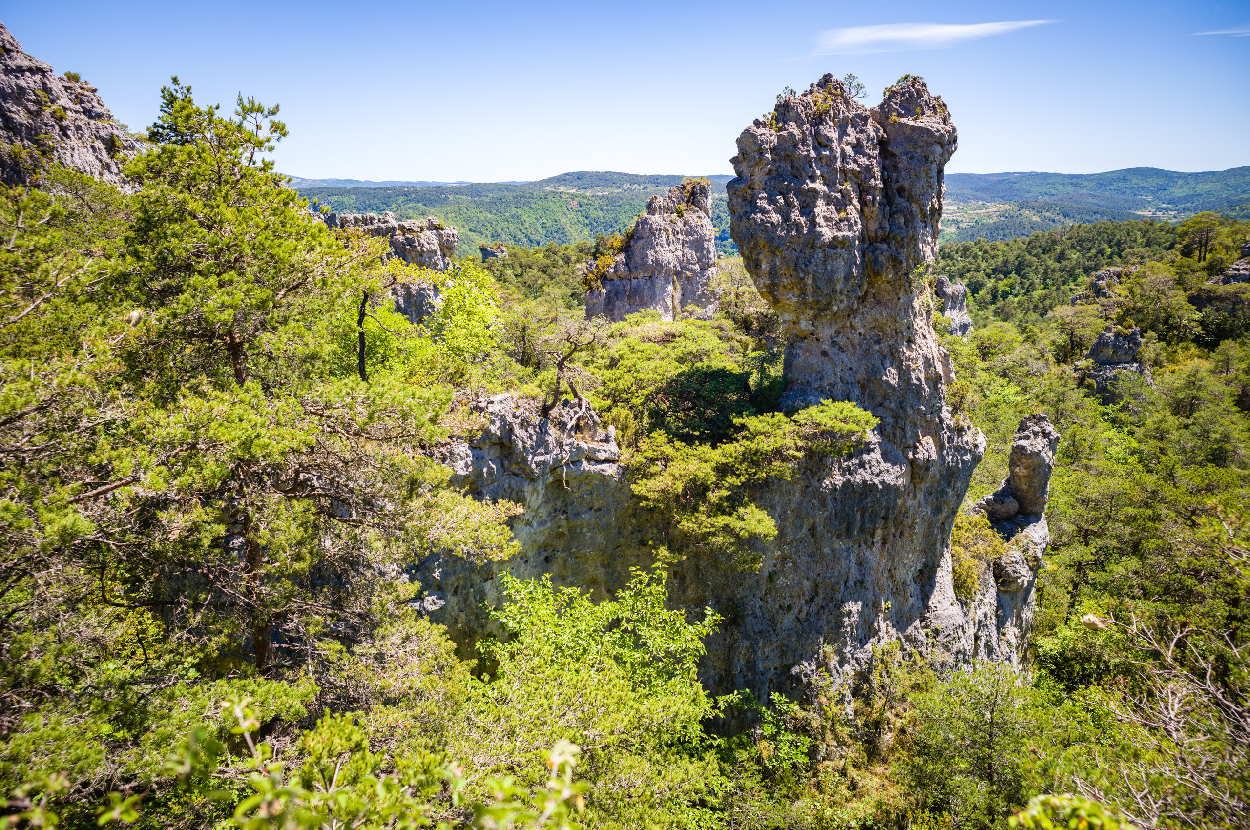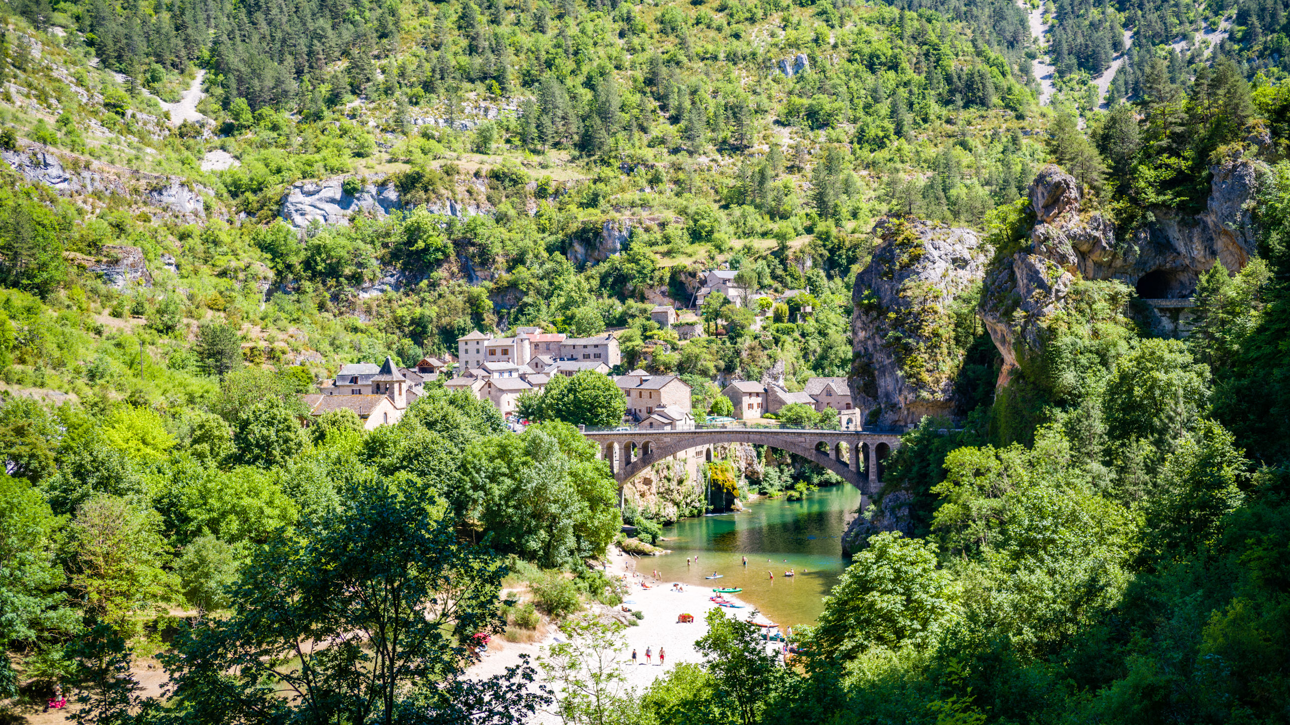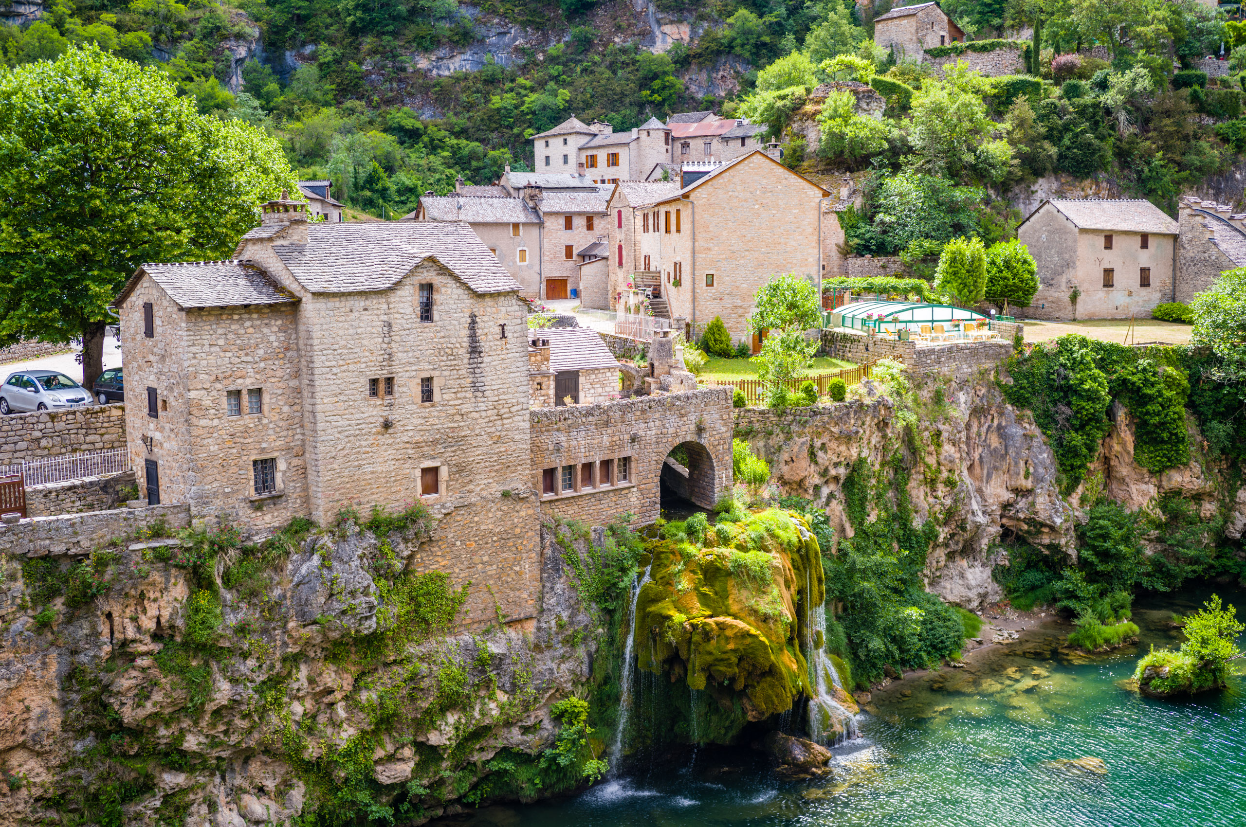 Beim abfahren in die Schlucht blies mir ein heisser Wind entgegen, als hielte ich mein Gesicht in einen Fön. Ich erkannte, dass das Klima im Vergleich zur Schlucht oben auf der Causse wesentlich angenehmer war. Der Wind kam stetig von Westen und brachte keinerlei Kühlung. Ich bog links auf die D907 ab und folgte ihr die gesamte Stecke über Le Rozier bis Aguessac. Die Tarnschlucht abwärts gibt es ein paar interessante Motive.