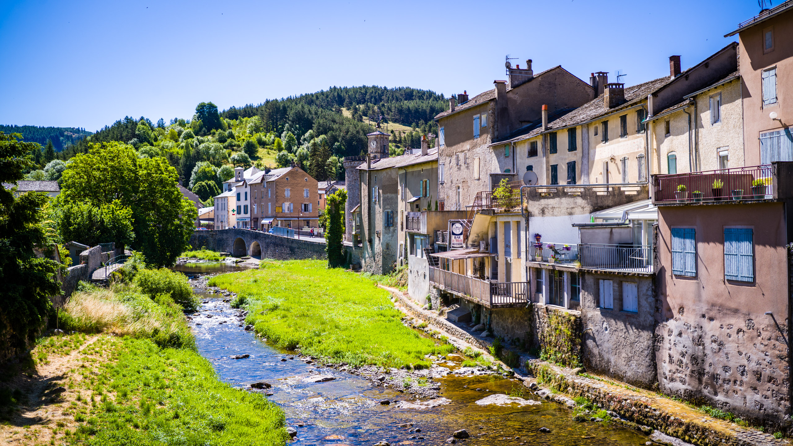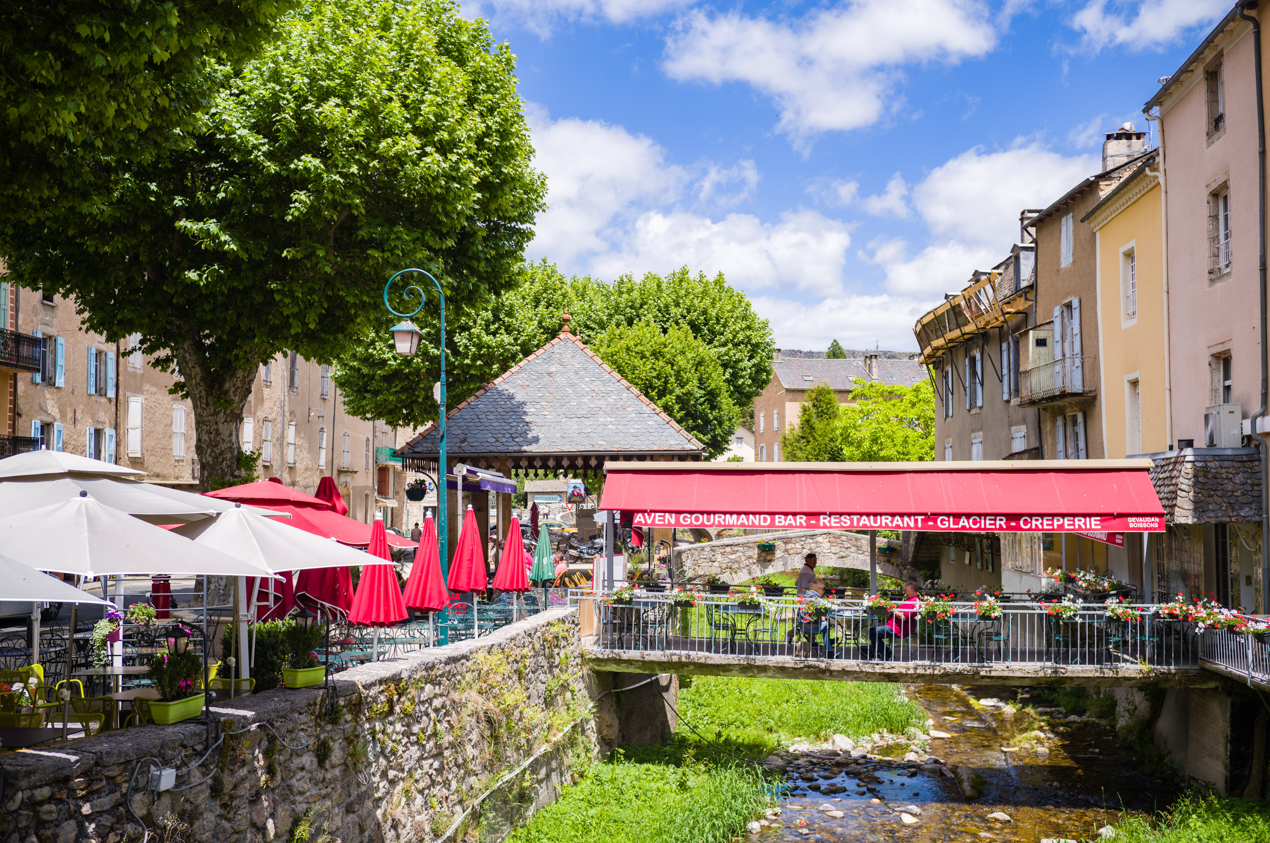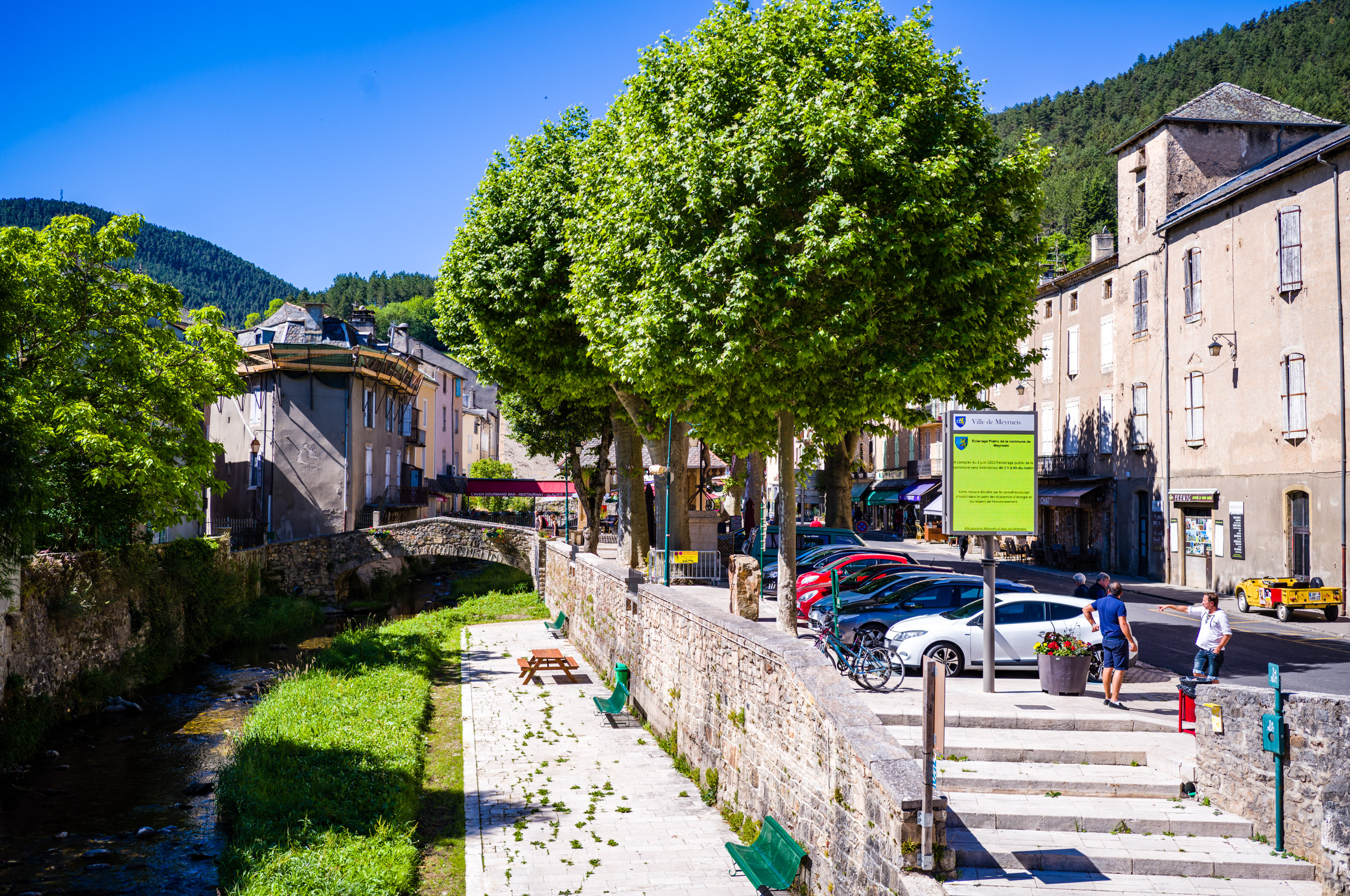 Bei Kilometer 38 bin ich einem Schleichweg gefolgt, den ich von früheren Aufenthalten in Meyrueis kannte. Die uralte Brücke „Pont des six Liards„, einziges Überbleibsel eines mittelalterlichen Klosters, überspannt hier den Jonte und ist fast so etwas wie ein geheimer Platz, weil kein durchreisender Tourist sie finden kann. Hinweisschilder an den Strassen gibt es nicht. Lädt zu einer kleinen Pause im Schatten ein.