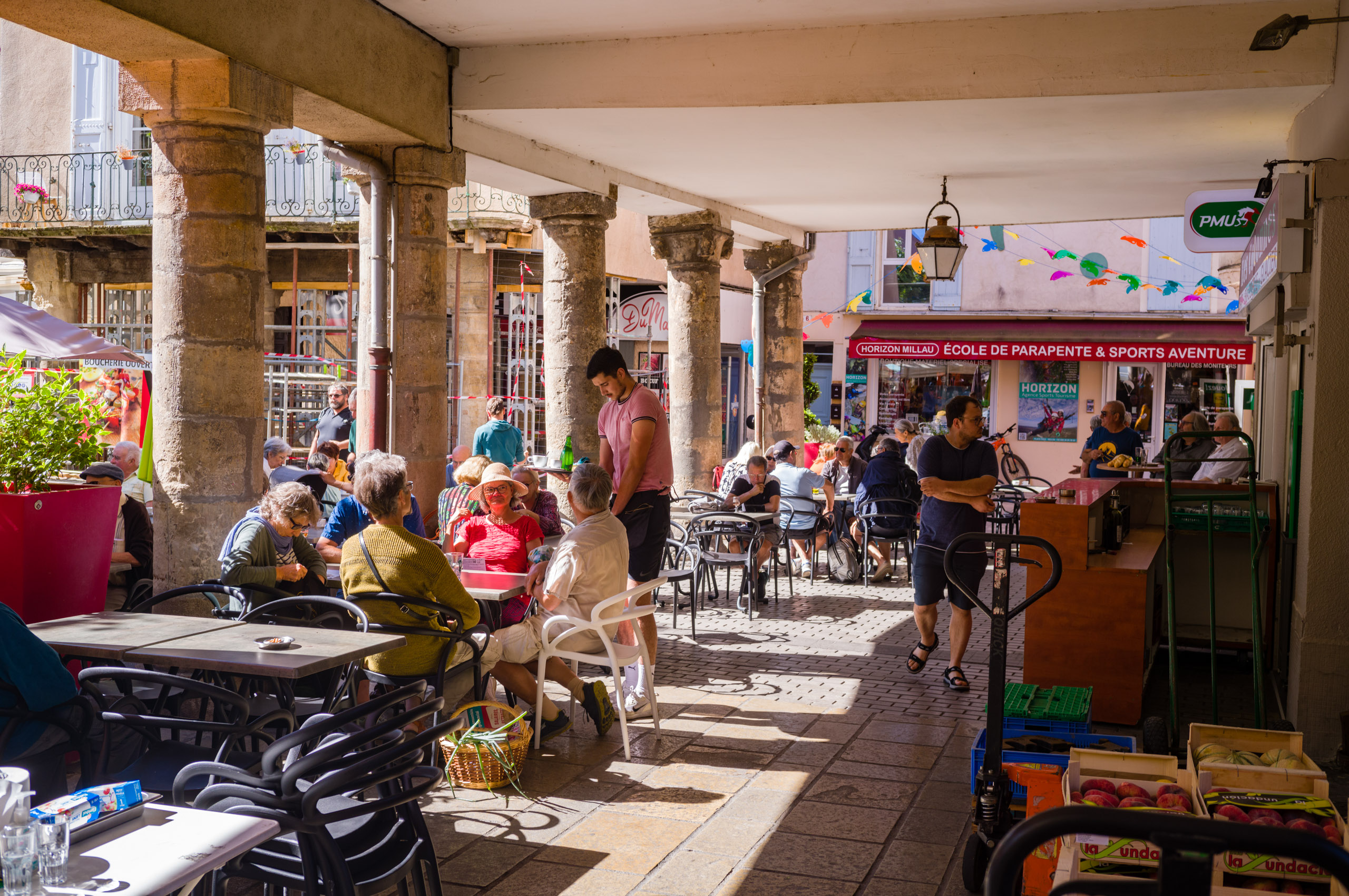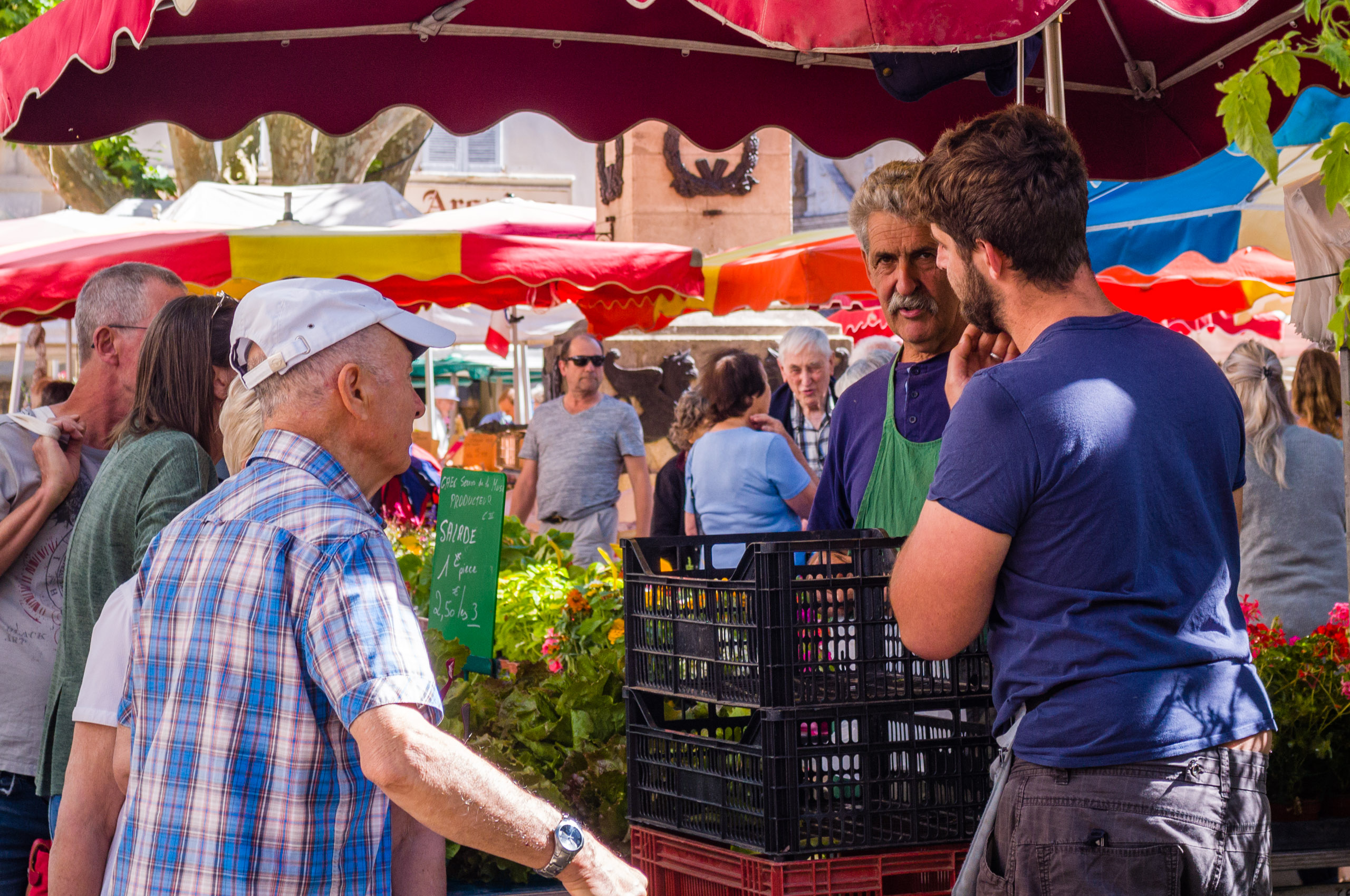 Freitags ist Wochenmarkt in Millau und da ist richtig was los. Ich flanierte hauptsächlich mit der Leica M4 darüber, geladen mit Silbersalz 250D. Als der verschossen war, drehte ich noch eine Runde mit der M11 und 35mm Ultron. An den Kameras und dass ich damit fotografierte, störte sich kein Mensch und ich bezweifle nicht, dass der Formfaktor wieder eine große Rolle spielte. Ich denke, die übliche Kombo fernöstlicher Hardware mit dickem Zoom-Objektiv davor würde ggf. mehr Anstoss erregen. Ich muss jetzt eine Kröte schlucken: Bei so einer Gelegenheit kann man natürlich mit 60MP (da ich sonst immer für weniger Auflösung plädiere) nachträglich eine Menge aus den Fotos isolieren, wenn man auf irrelevanten Kontext verzichten will.
