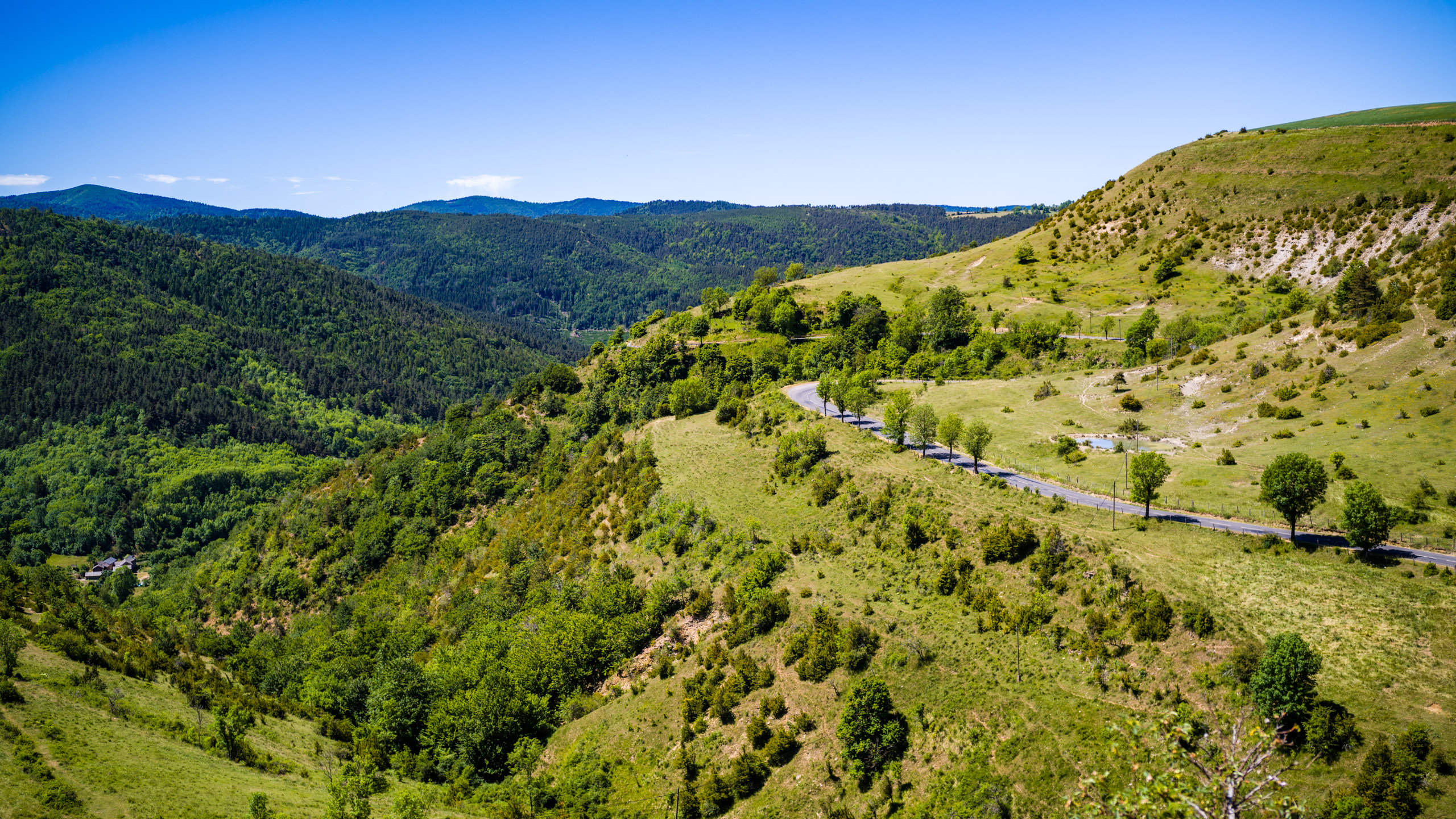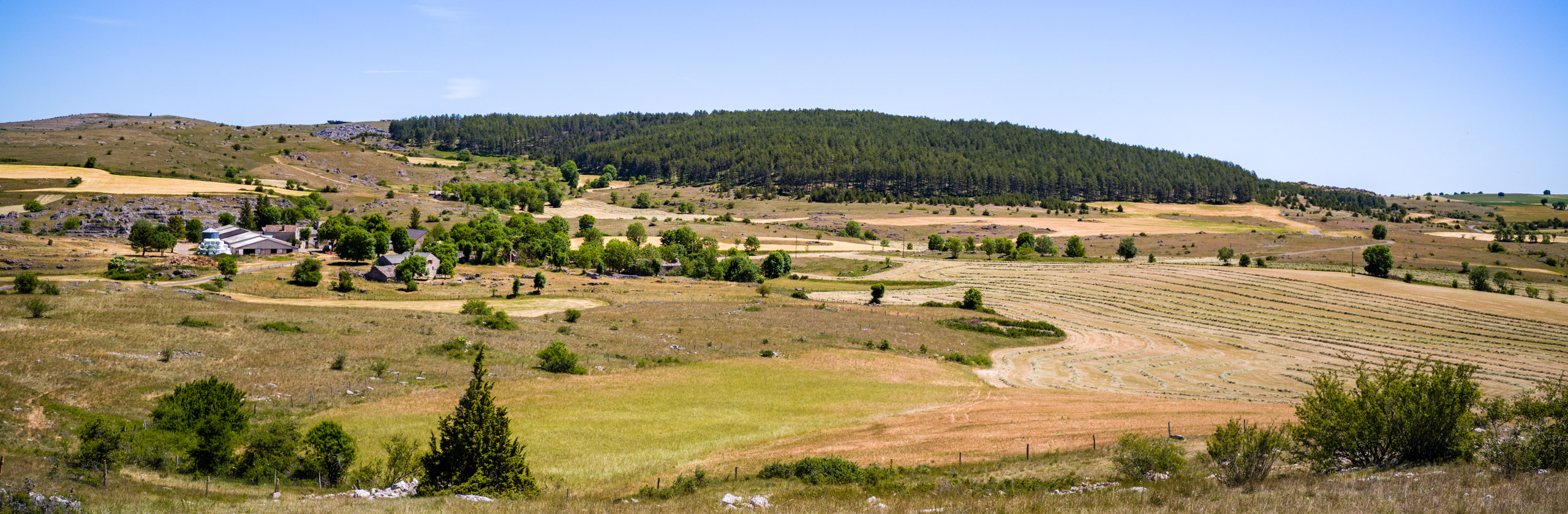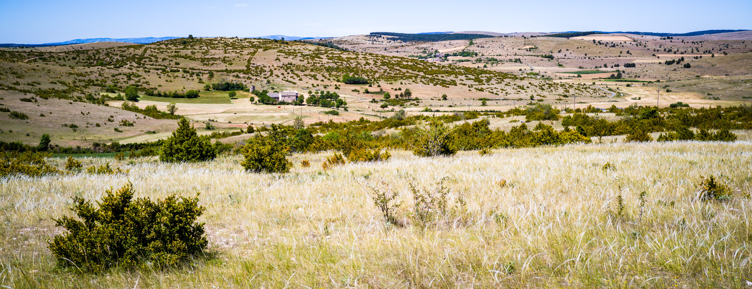 Folgt man dem Pfad über die Brücke, kommt man wieder auf die D996. Die Strasse steigt stetig, aber angenehm mit 6-7%, bis man den Col de Perjuret erreicht (Kilometer 48). Am Col verliess ich die Hauptstrasse scharf links und machte mich an die Überquerung der Causse Mejean Richtung Montbrun. Ein Abstecher zum „Chaos von Vieux Nimes“ blieb undokumentiert. Die asphaltierte Strasse endet auf einem Gehöft „Le Veygalier“, das einladend genug ist. Man kann dort parken und einen „Sentier Geologique“ (geologischem Pfad) folgen, um sich die bizarren Gesteinsformationen anzusehen. Ich war aber am Tag zuvor erst in „Vieux Montpellier“ gewesen und hatte genug von den Brocken gesehen. Es gibt von dort eine Schotterstrasse Richtung Florac, aber das wollte ich mir nicht antun. Ich fuhr die kurze Strecke zurück bis zur Kreuzung und folgte dann der mir bekannten Strasse, die zunächst am Rand der Schlucht entlang führt (wo es einen Aussichtspunkt zur Beobachtung der Geier gibt) und und sich dann nach Norden Richtung Hures wendet.