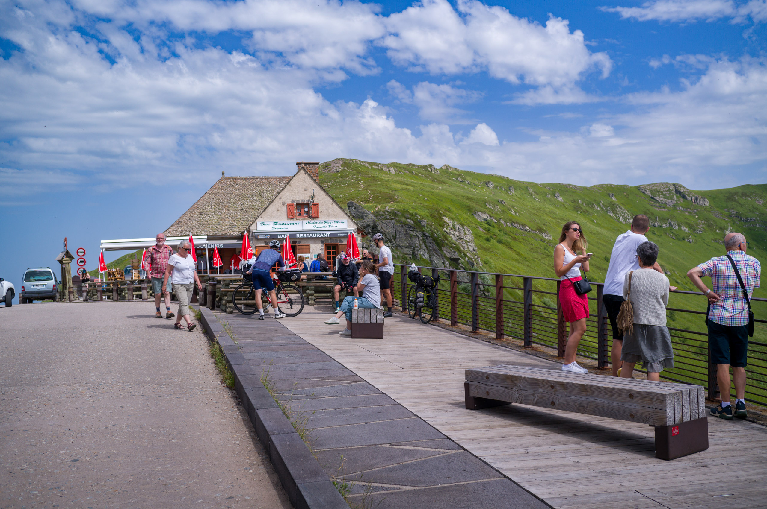 Am Pas de Souci ist eine Aussichtsplattform. Ich kaufte mir im Kiosk unten zwei Orangina. Zutritt zur Plattform kostet 50 Cent und ich bekam dafür von dem Kiosk-Besitzer die Zusicherung, ein Auge auf mein Rennrad zu haben. Oben kippte ich die Orangina quasi auf Ex, genoss die Aussicht und tauschte Höflichkeiten über die schöne Aussicht mit einem französischen Ehepaar aus.