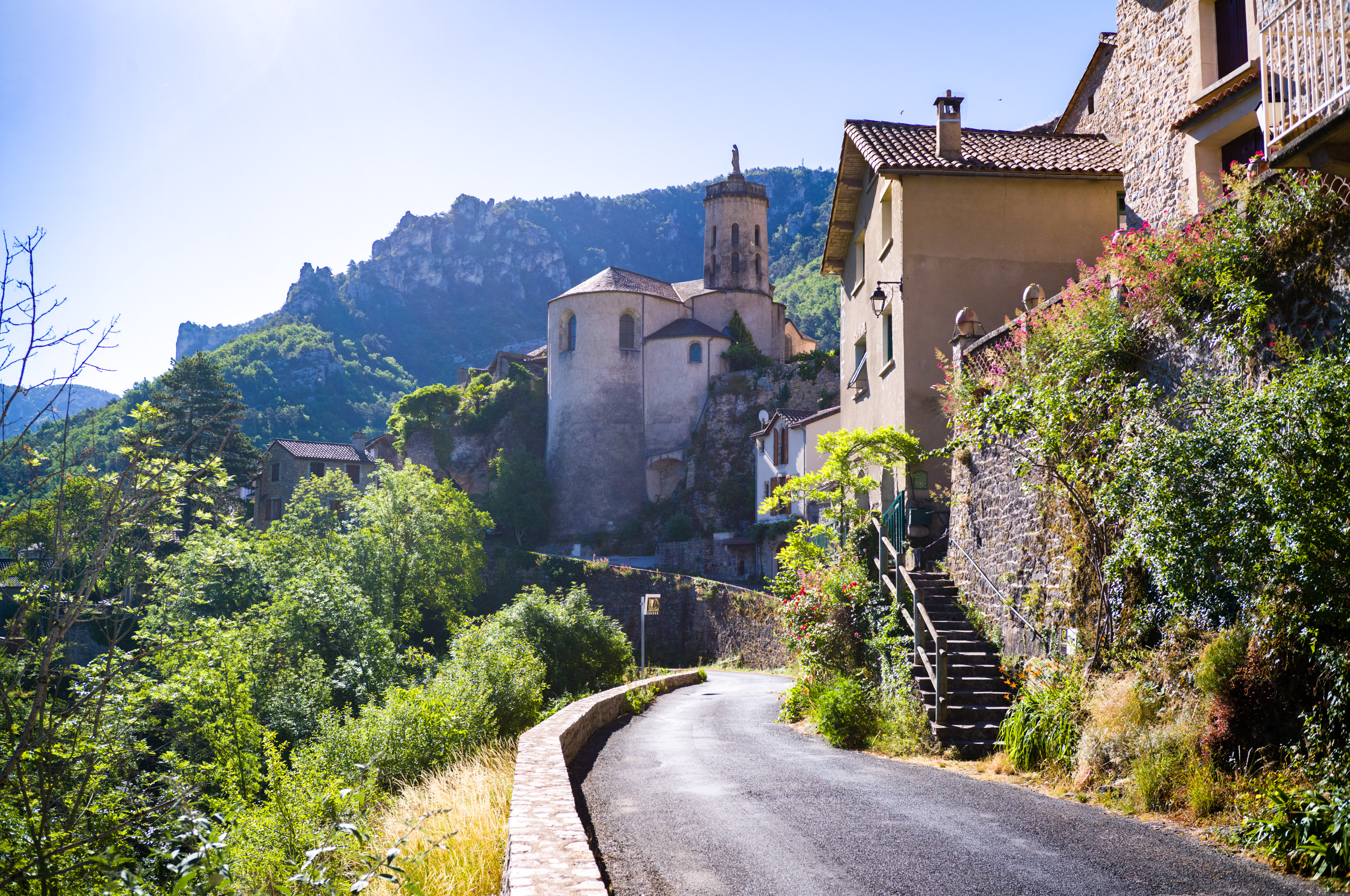 So machte ich diverse Touren durch die Täler und über die Hochebenen, den „Causses“ (die selbst gar nicht so eben sind, das geht immer so zwischen 900 und 1100 Meter Höhe hoch und runter). Ich startete immer morgens, wenn es noch kühl war und war nachmittags zurück, mehr oder weniger ausgepowert. Meist ruhte ich mich den Rest des Nachmittags aus und machte dann noch eine kleine Abendrunde auf dem E-Bike. Ja, richtig gelesen. E-Bike. Ideal, um sich die Beine zu lockern und ausserdem prima zum einkaufen am Ort und ein bisschen Sightseeing, wenn man nicht überall als Mamil (=Middle-aged man in Lycra) auftauchen will. Der Bulli kann stehen bleiben. Vor ein paar Jahren war meine Einstellung zu E-Bikes eher sarkastisch, aber inzwischen finde ich es als Verkehrsmittel sehr praktisch. Und hey: Jeder kann selbst entscheiden, wieviel „E“ er in Anspruch nimmt. Das kann auch ziemlich sportlich werden. Mein Cube mit dickem Akku und Bosch-Performance CX-Motor lässt jedenfalls alle Optionen offen.
