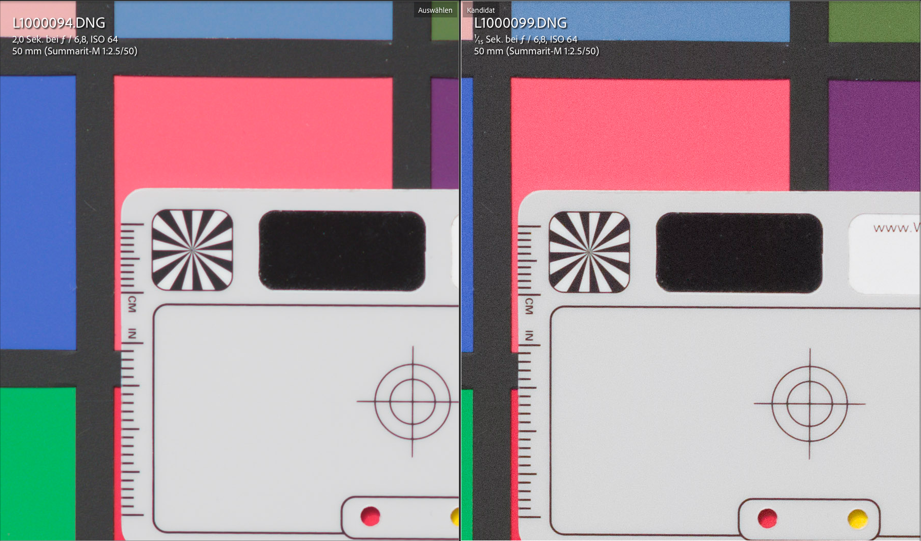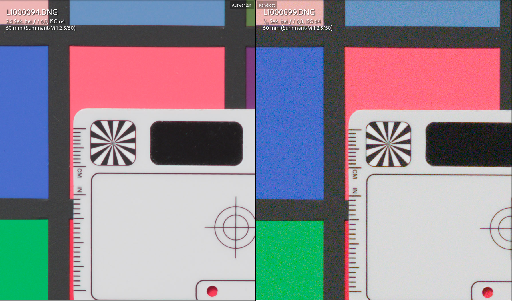 In dem Zusammenhang habe ich auch schon eine weitere Eigenschaft des neuen Sensors untersucht. Er verhält sich nämlich „invariant“ (wie es auch schon der der M10 tat). Auf der Leica-Webseite zeigt Nick Rains einige (Gegenlicht-)Fotos aus der M11, bei der er die Schatten extrem aufhellen konnte, ohne sich übermäßiges Rauschen einzufangen. Das ist ein Hinweis auf invariantes oder „isoloses“ Verhalten. Bei einem improvisierten Versuchsaufbau bei mir zuhause habe ich ein Foto bei ISO 64 gemacht und dann sukzessive bis zu 6 Blenden unterbelichtet. Anschliessend zog ich die unterbelichteten Fotos in LR wieder auf den neutralen Wert hoch. Sicher nimmt das Rauschen zu, aber es zeigt die hohe Flexibilität, die die DNG-Dateien aus dem Sensor beim Postprocessing bieten. Die „originale“ M10 konnte das auch, nur scheint mir bei dem neuen Sensor ein Zugewinn von grob einer bis anderthalb Blenden zu sein.