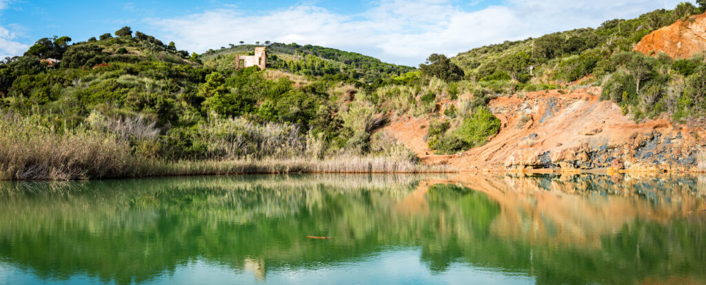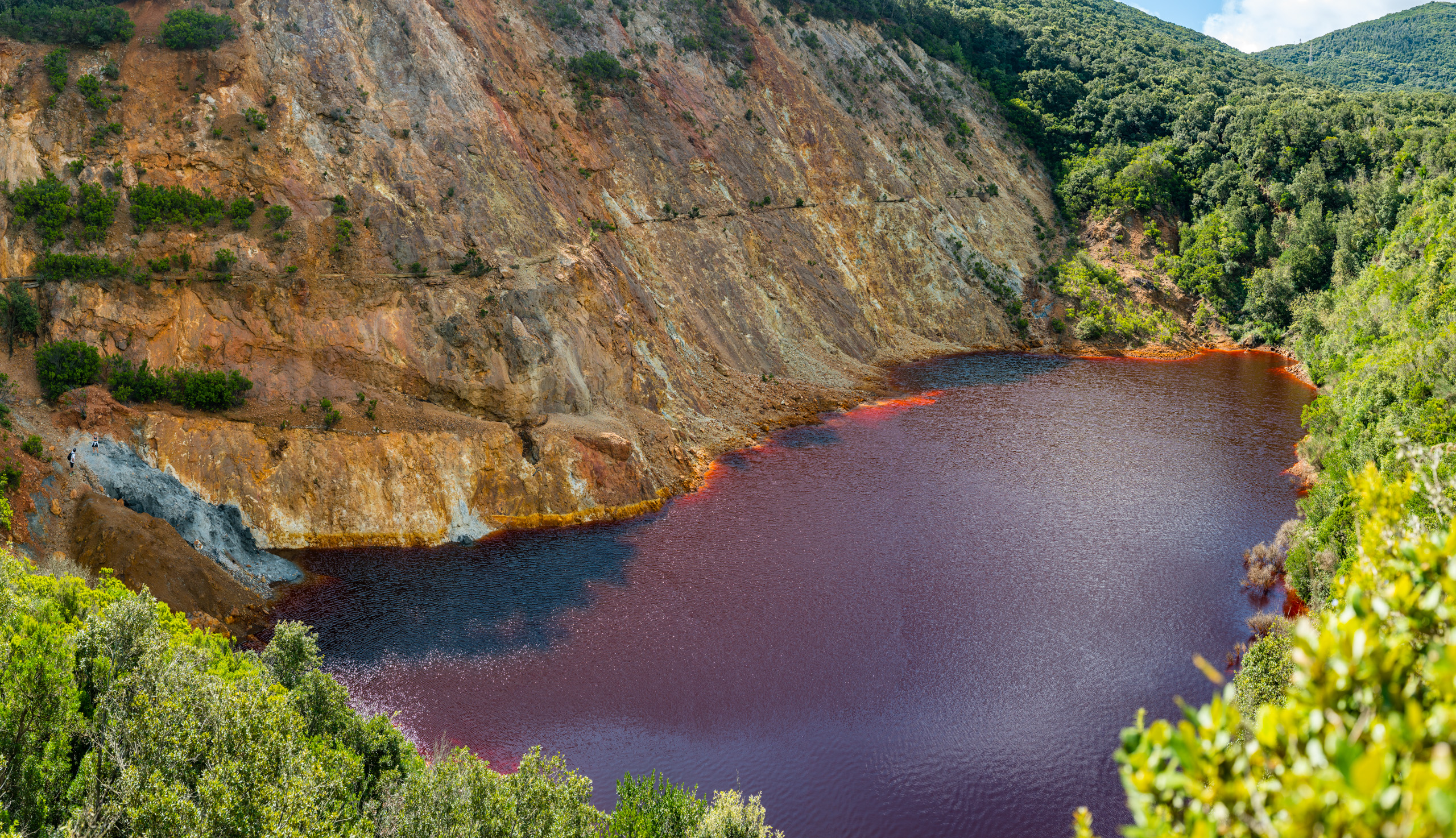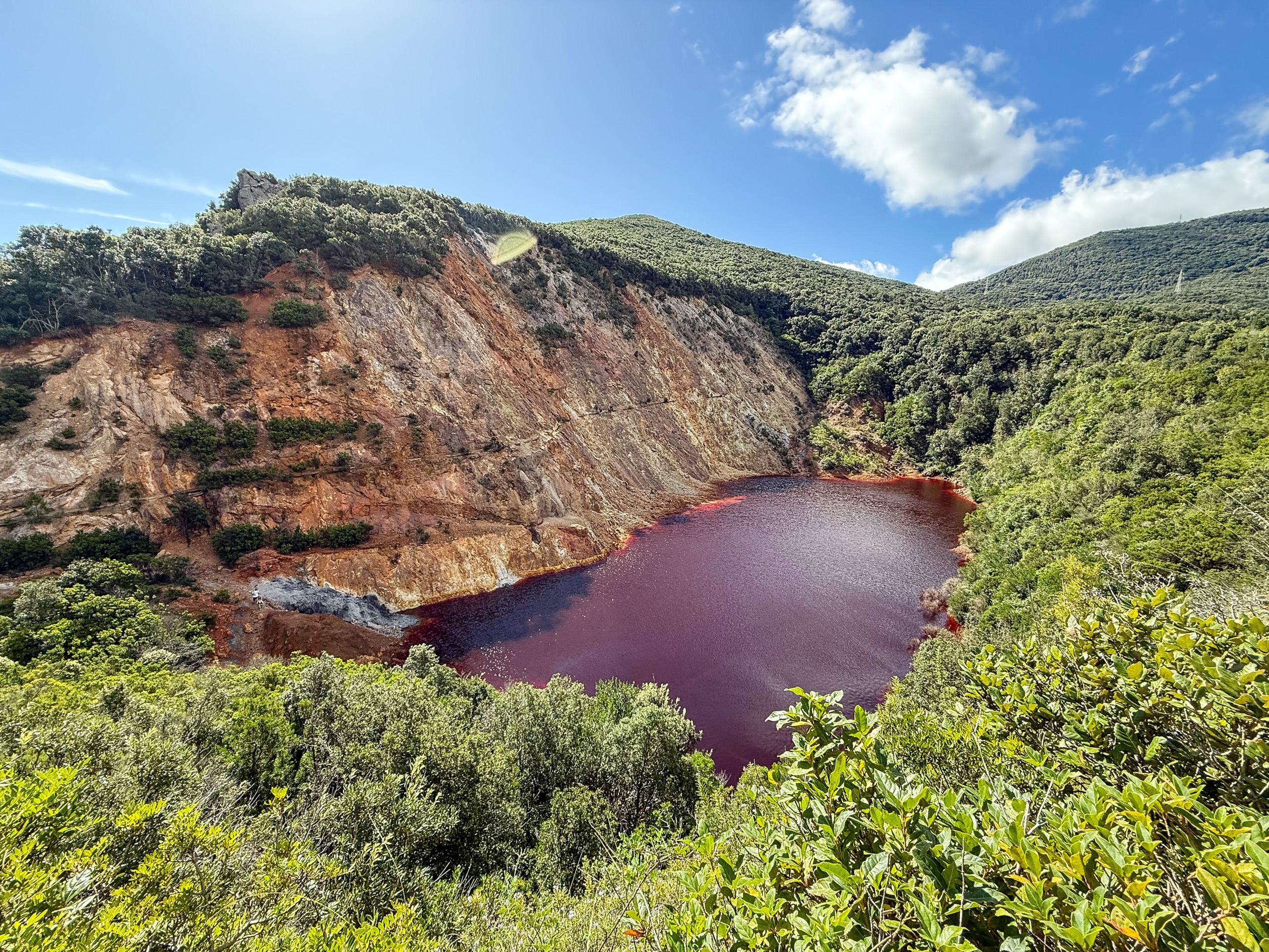 Es gibt diverse (stillgelegte) Abbaustätten auch in der Gegend von Rio nell’Elba. Was mich neugierig machte, war der „Laghetto delle Conche“, ein kleiner See so rot wie Blut (oder Lila, je nach Sonnenwinkel). Die Färbung erklärt sich aus im Wasser gelösten Hämatit. Von der SP 33 oberhalb des Sees geht ein Wanderweg ab (der zugleich MTB-Strecke ist). Der Weg führt durch die typischen Steineichen leicht bergab und ist von interessant gefärbten Steinen geprägt. Am See stellte ich fest, dass 43mm mal wieder zu wenig Weite lieferten, um den See zu erfassen. Klarer Fall für ein Panorama. Nur diesmal war ich zu sparsam mit den Einzelaufnahmen: Ich machte vier in einer Reihe und hätte besser zwei Reihen übereinander gemacht, um das gleiche zu erreichen, was ich mit dem iPhone 16 und der 13mm (auf Kleinbild umgerechnet) Weitwinkelkamera machen konnte. Aber hinterher ist man immer schlauer.