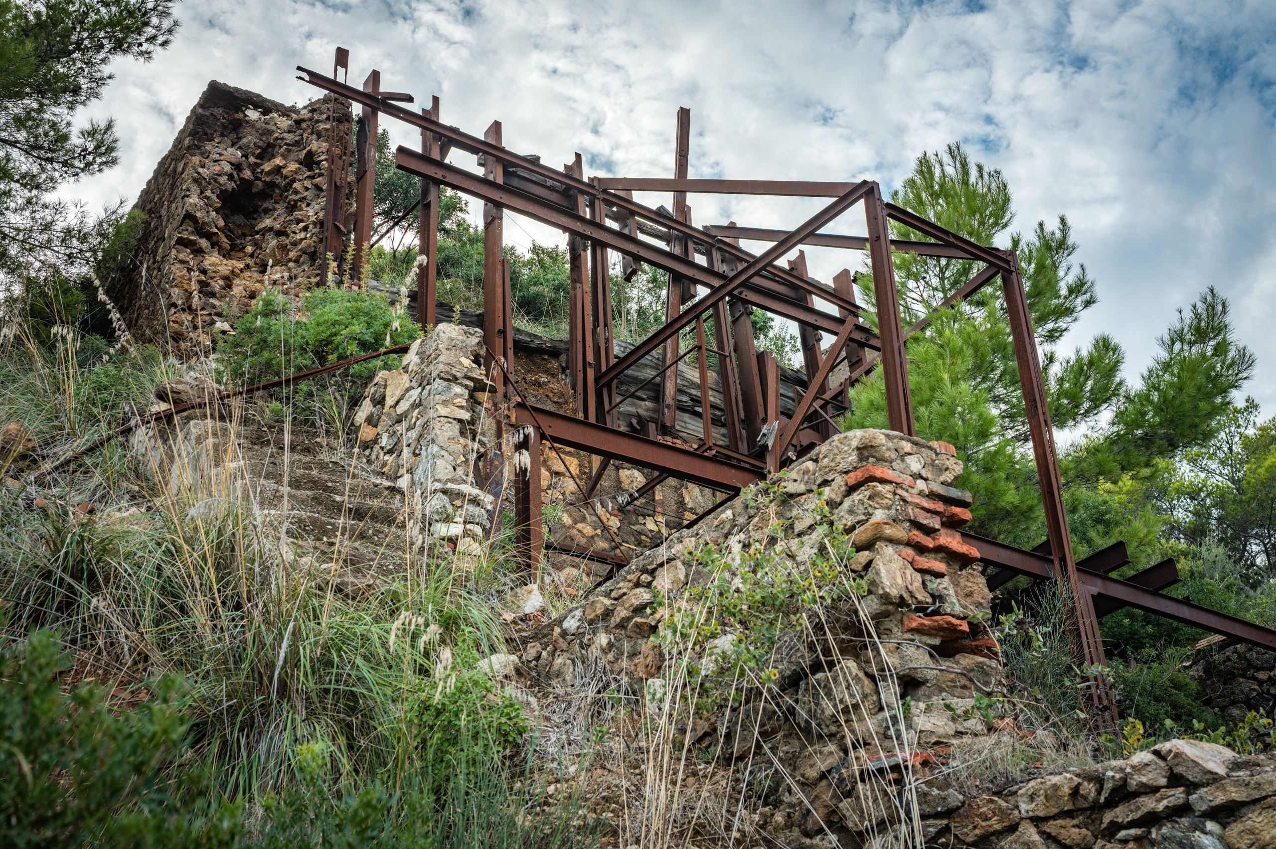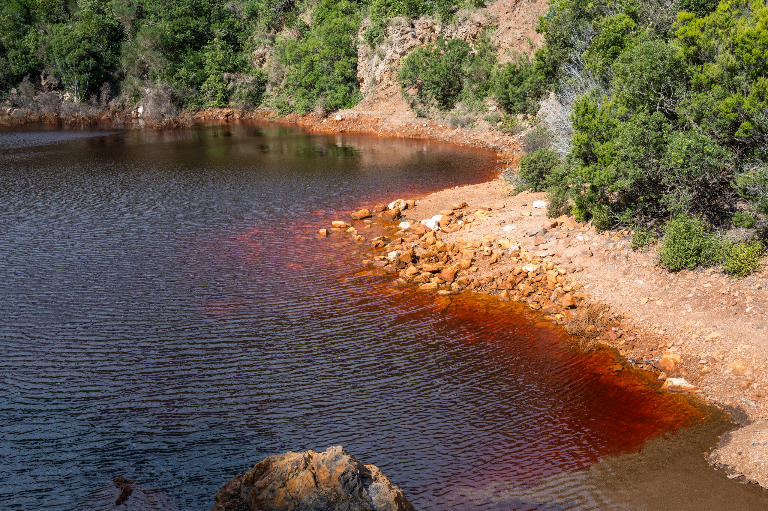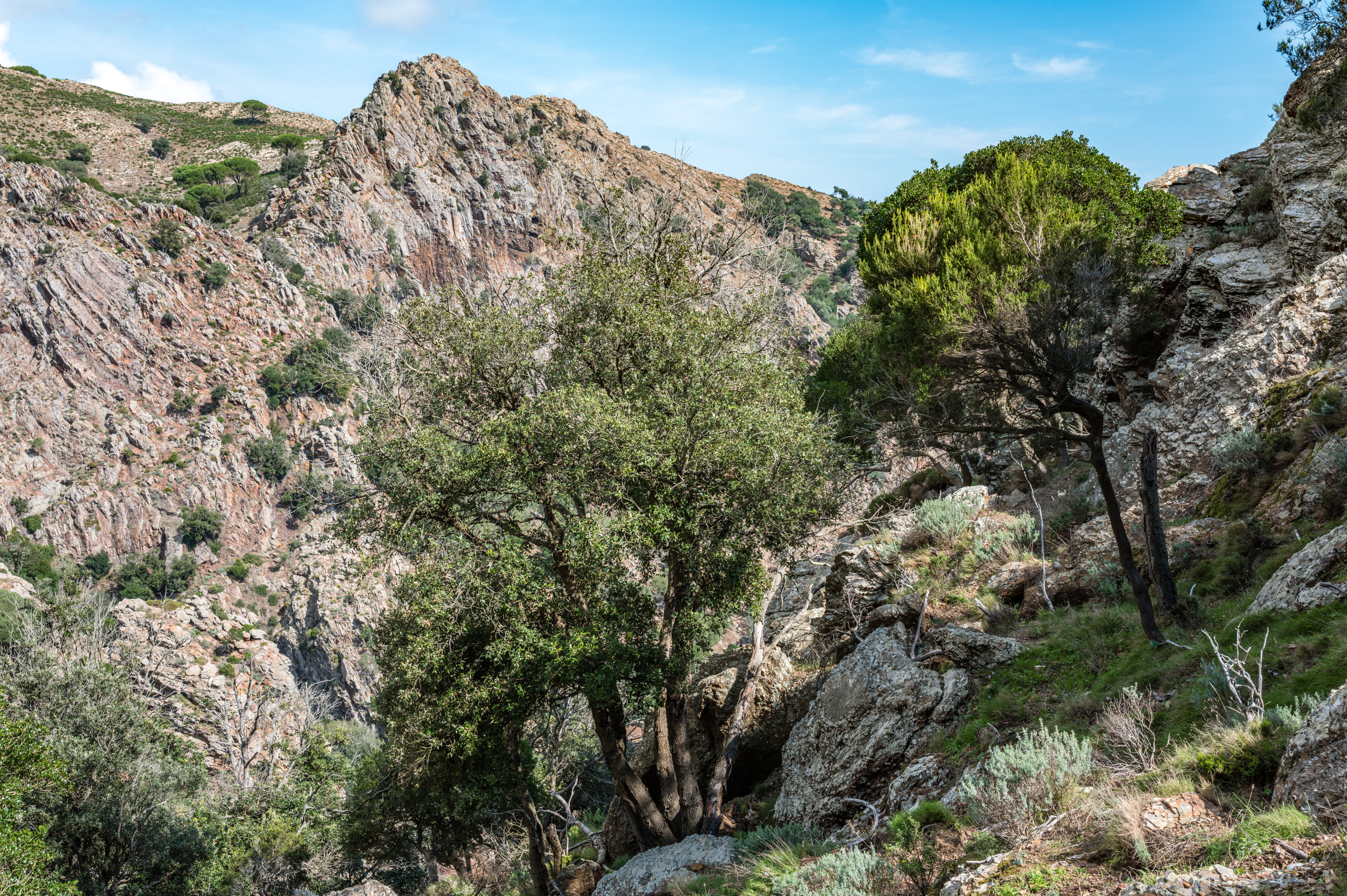 Es gibt diverse (stillgelegte) Abbaustätten auch in der Gegend von Rio nell’Elba. Was mich neugierig machte, war der „Laghetto delle Conche“, ein kleiner See so rot wie Blut (oder Lila, je nach Sonnenwinkel). Die Färbung erklärt sich aus im Wasser gelösten Hämatit. Von der SP 33 oberhalb des Sees geht ein Wanderweg ab (der zugleich MTB-Strecke ist). Der Weg führt durch die typischen Steineichen leicht bergab und ist von interessant gefärbten Steinen geprägt. Am See stellte ich fest, dass 43mm mal wieder zu wenig Weite lieferten, um den See zu erfassen. Klarer Fall für ein Panorama. Nur diesmal war ich zu sparsam mit den Einzelaufnahmen: Ich machte vier in einer Reihe und hätte besser zwei Reihen übereinander gemacht, um das gleiche zu erreichen, was ich mit dem iPhone 16 und der 13mm (auf Kleinbild umgerechnet) Weitwinkelkamera machen konnte. Aber hinterher ist man immer schlauer.