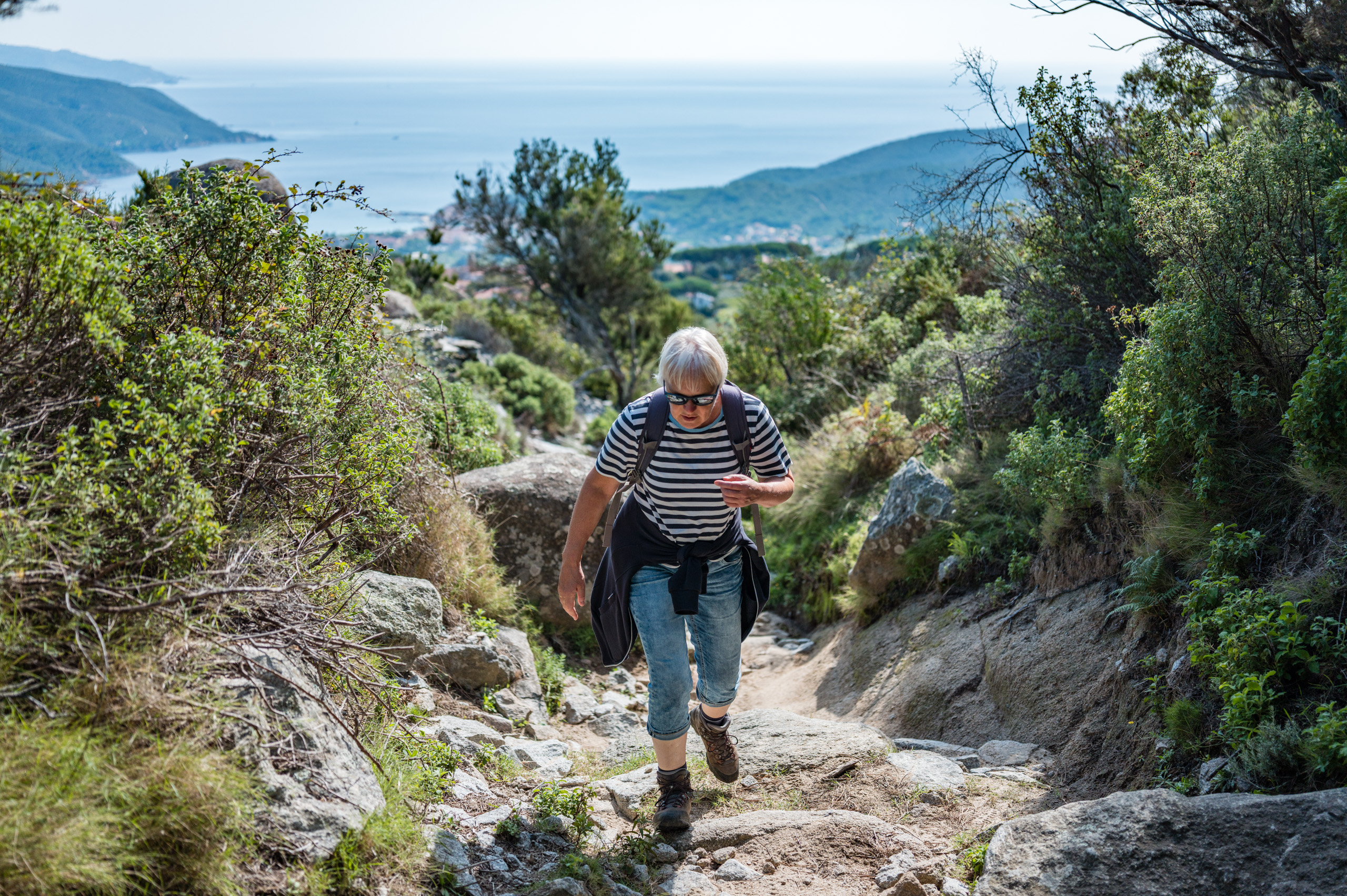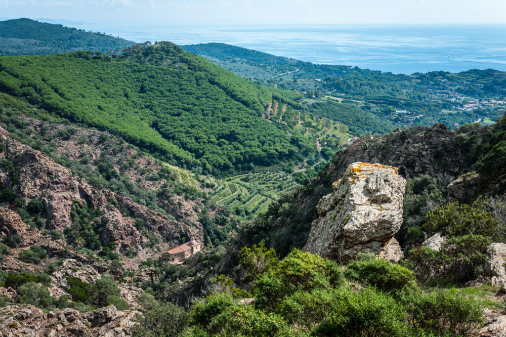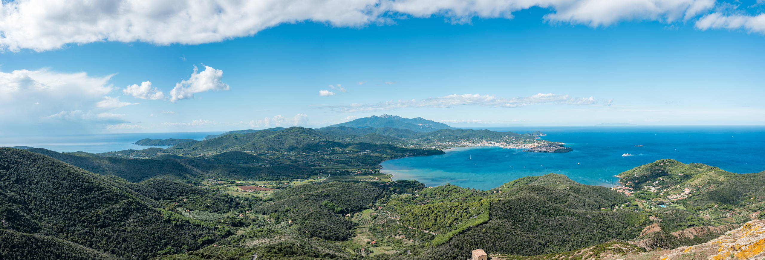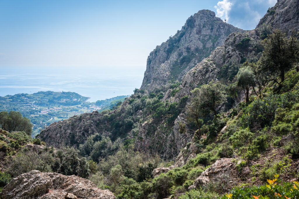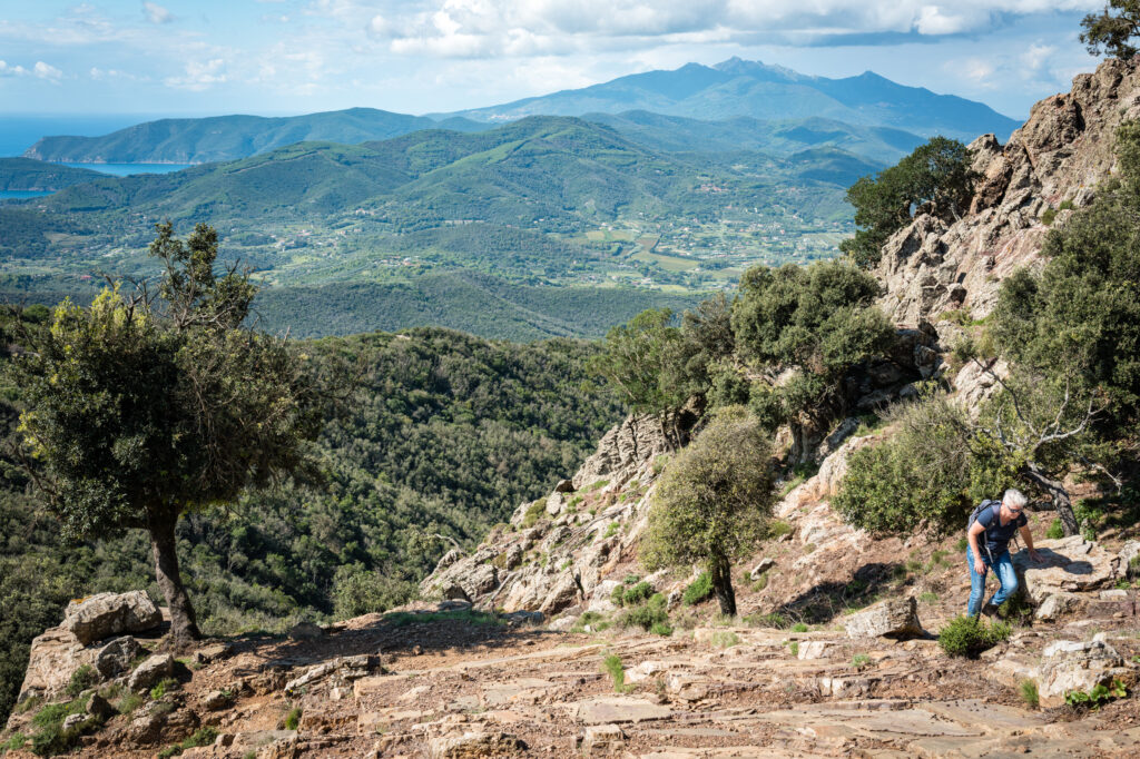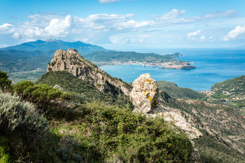Nach zwei Tagen auf der Insel traute ich mir die ersten kleinen Wanderungen zu . Wir stiegen zur Fortezza del Volterraio auf, einer Burgruine, die oberhalb des Passes aufragt und eine charakteristische Skyline erzeugt, die den östlichen Teil Elbas dominiert. Eine an sich leichte Wanderung, wenn man von einem Parkplatz startet, der auf halber Höhe der Serpentinen der Passstrasse von Bagnaia herauf liegt. Die Aussicht ist atemberaubend (wie von vielen Passhöhen und Gebirgskämmen der Insel, was wir noch erleben durften), über Portoferraio hinaus auf den Monte Capanne (den höchsten Berg) überblickt man den gesamten westlichen Teil Elbas.