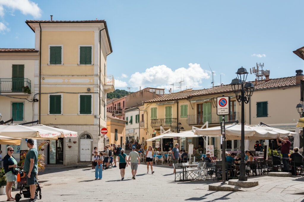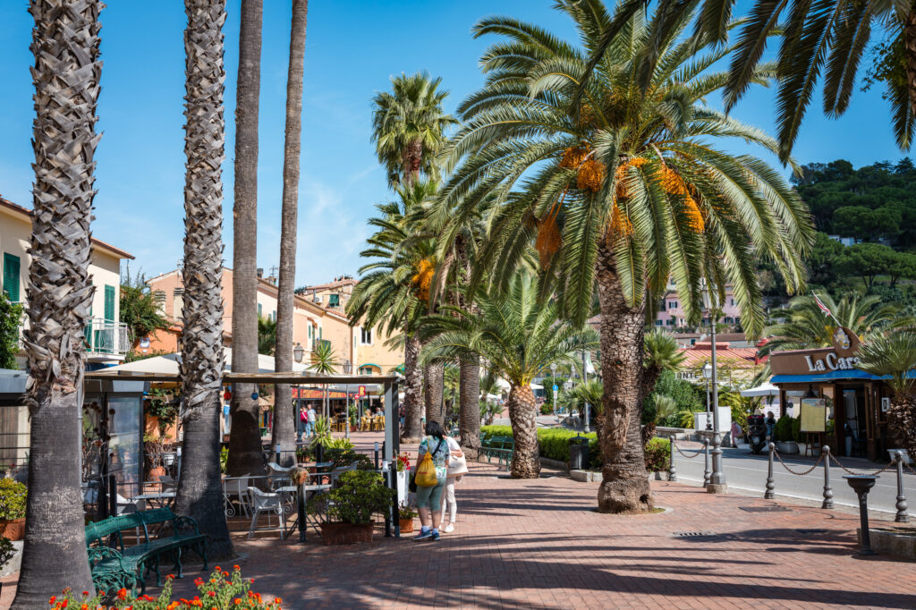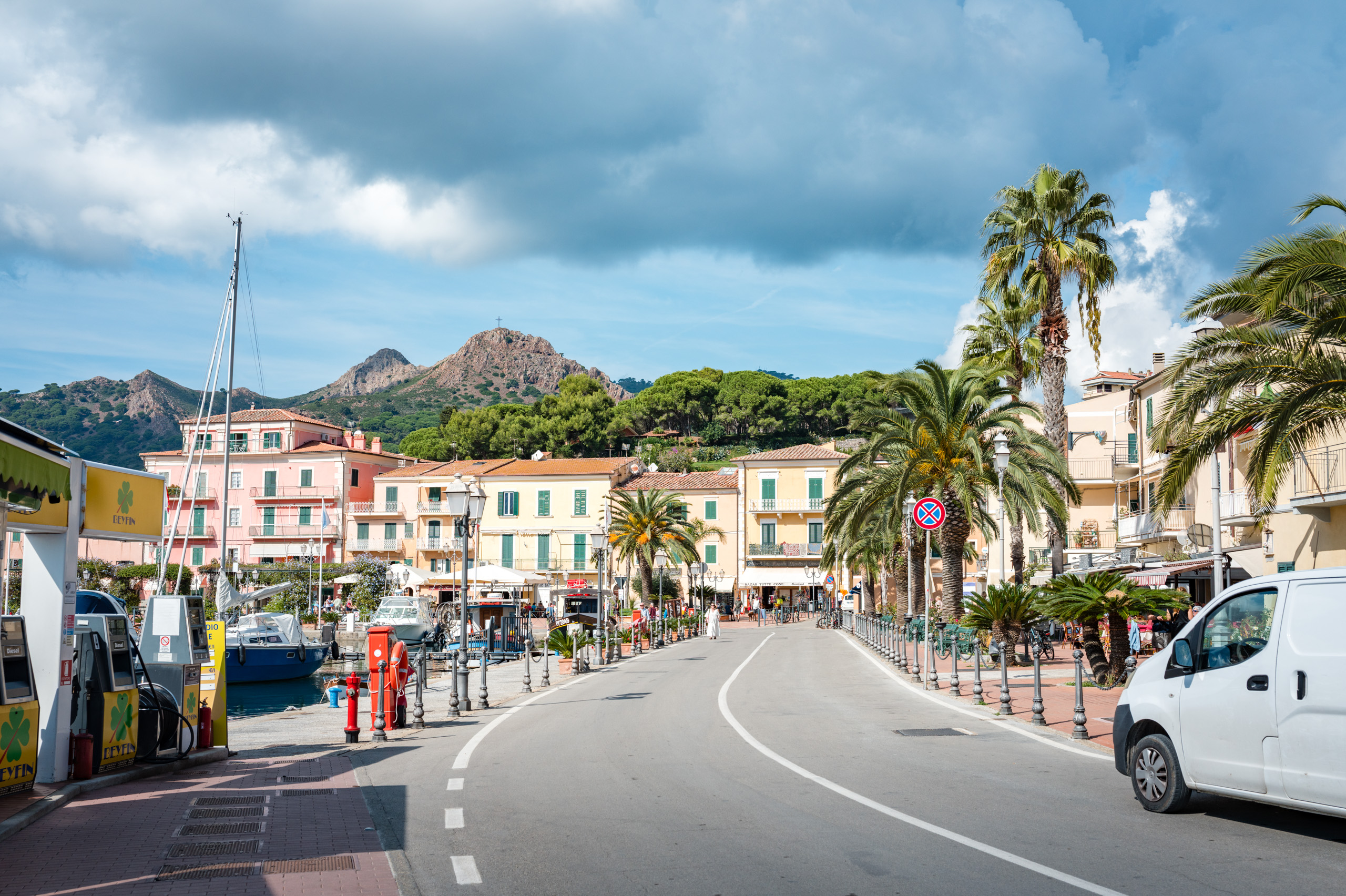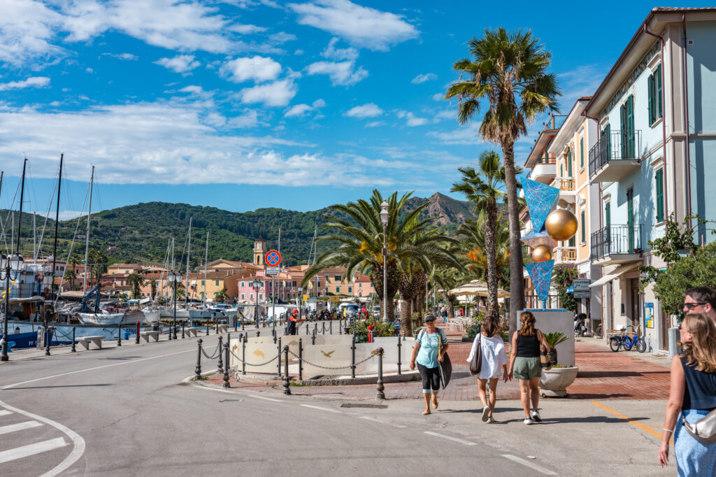 Von den Hafenstädten würde ich Porto Azurro besonders hervorheben. Es gibt eine schöne Front zum Hafen hin mit Piazza und einer liebevoll restaurierten Altstadt. An der Piazza haben wir öfter gesessen und mit einer Portion Eis oder einem Caffé das Ambiente genossen. Am nordöstlichen Ende der Bucht gibt es einen Weg unterhalb der Festung San Giacomo (ein Knast, die Kurgäste brauchen eine spezielle Qualifikation). Der Weg führt um die Landzunge zum nächsten Strand (ca. 15 Minuten), dem Spaggia di Barbarossa. Will man dies zu einer kleinen Wanderung ausdehnen, geht es weiter über Spaggia Reale zum („schwarzen“) Terranera-Strand.