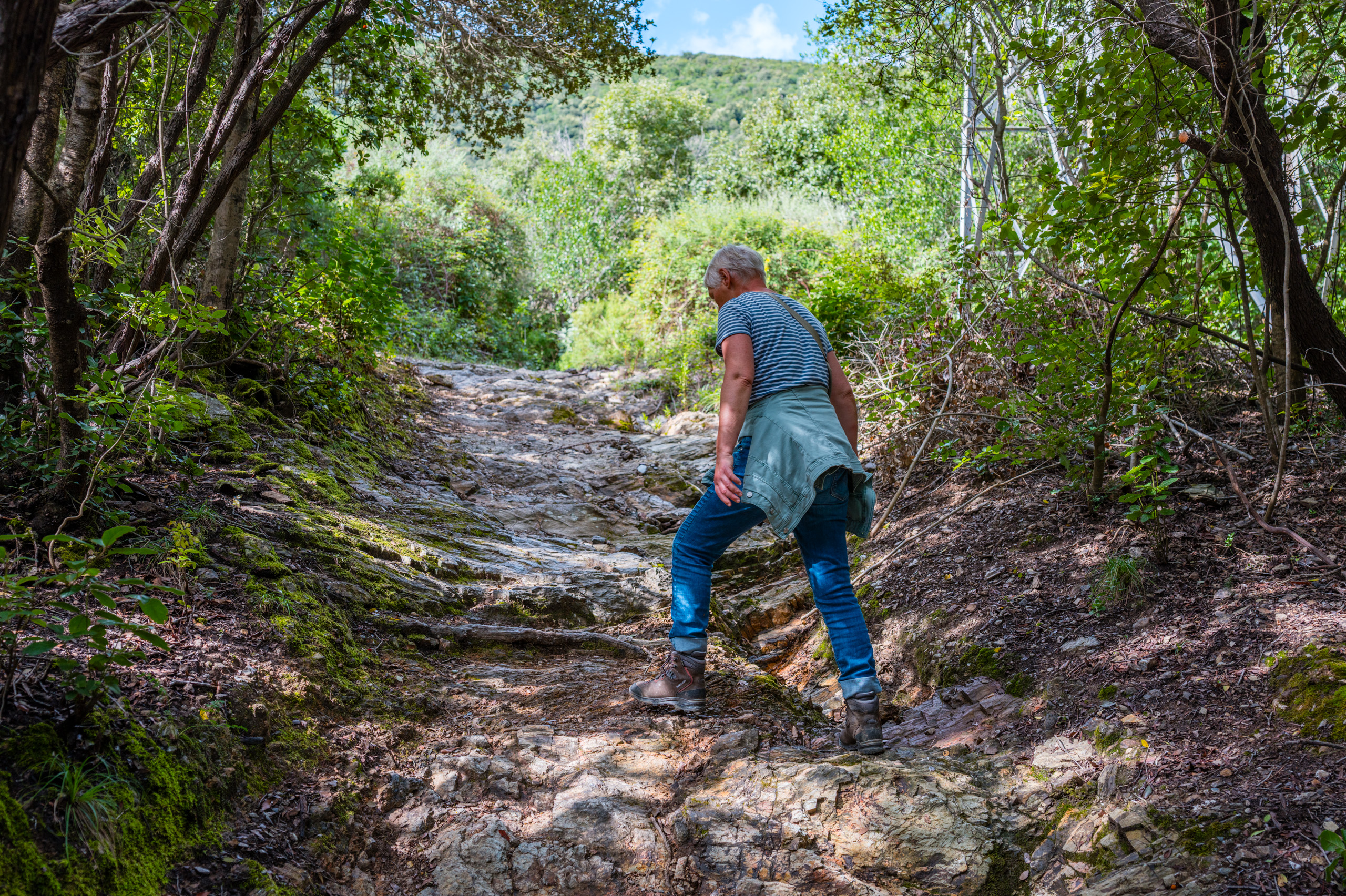 Wir hielten uns dort nicht lange auf, sondern gingen auf den Kammweg in Richtung Cavo. Ein deutsche Wandergruppe von fast dreissig Teilnehmern hatte es schlechter getroffen: Sie wollten eigentlich den Kammweg in die andere Richtung nehmen, hätten dazu aber die Strasse überqueren müssen, die kategorisch gesperrt war. Sie waren gezwungen, eine Rennpause kurz vor 13.00 Uhr abzuwarten. Wir hingegen gingen eine kleines Stück über den Kamm und stiegen von dort wieder ab nach Rio. Wir waren vom in den Bergen widerhallenden Gedröhn der offenen Ansaugstutzen der alten Vergasermotoren leicht angefressen, weil das das Wandererlebnis deutlich schmälerte.
