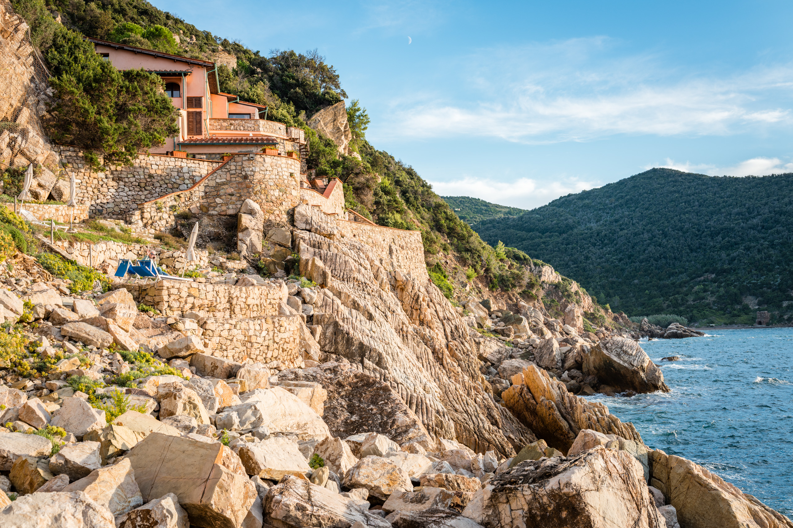 Das Haus selbst war wunderschön in die Klippen am Meer gebaut, in mehreren Etagen gab es Apartments mit Blick auf das Tyrrhenische Meer. Bei ruhiger See konnte man über eine steile Treppe zum Wasser absteigen und schwimmen gehen. Ansonsten genossen wir fast jeden Abend (wenn wir nicht irgendwo essen waren) einen Sundowner auf der Terrasse, meist mit anderen Bewohnern. Wir probierten gegenseitig die Weine, die wir von unterschiedlichen Domänen Elbas mitgebracht hatten und tauschten uns kulturell aus. Mit einem italienisches Paar aus Piacenza, einem Paar aus Wien und einem aus München war immer gute Stimmung beim Sonnenuntergang, der jeden Abend anders aussah. Man blickt von da weit über die Bucht nach Portoferraio und auf den Monte Capanne.