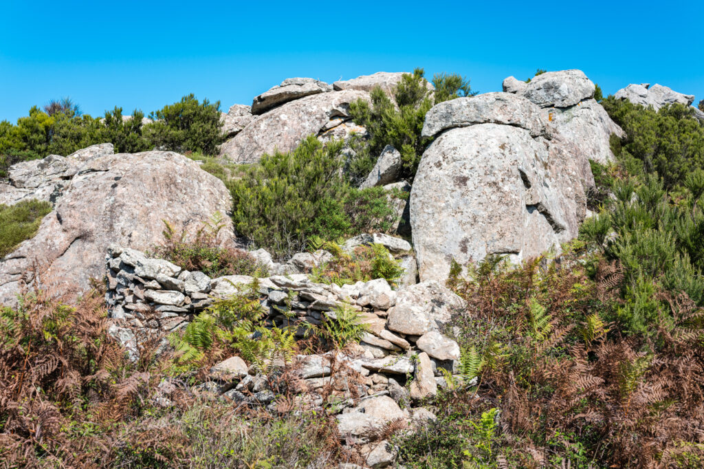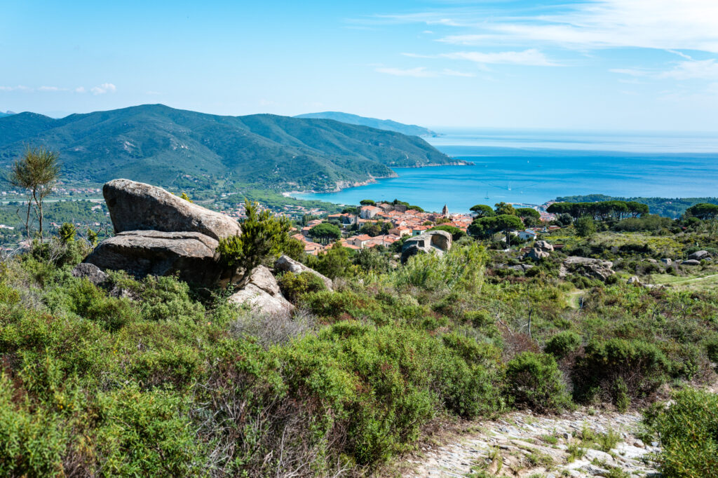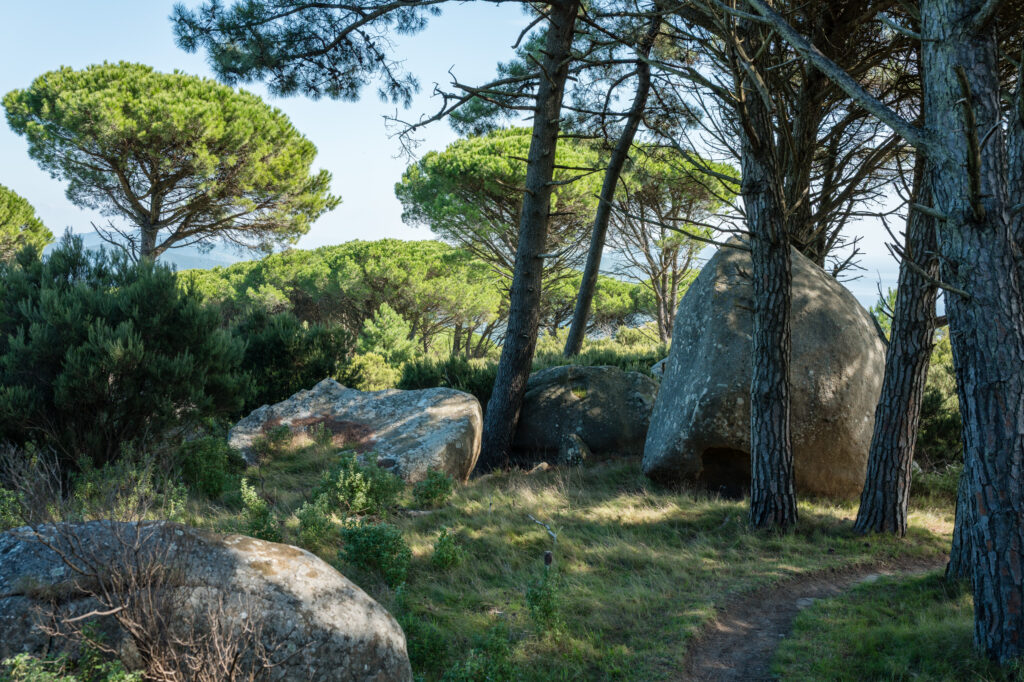 Die Gegend um Pietra Murata herum gehört zum ältesten Siedlungsgebiet der Insel (seit der Bronzezeit). Es sieht aus, als hätten hier Riesen mit einem Steinbaukasten gespielt. Die Aussicht auf die Südküste, die Insel Pianos und bis Korsika ist fantastisch. Der Wanderweg ist zugleich eine (anspruchsvolle!) MTB-Strecke, man achte also auf Downhiller.