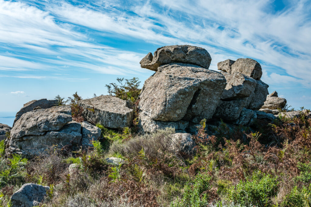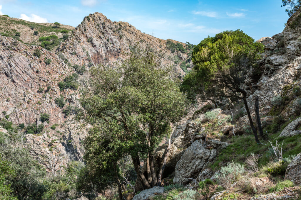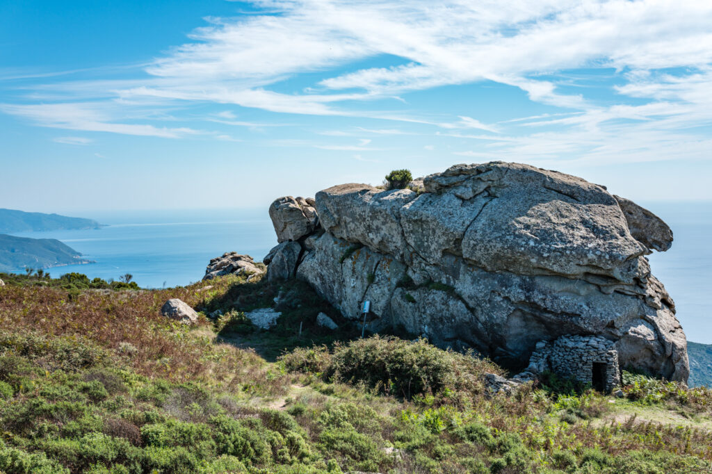Oberhalb des Ortes San Piero im Bereich des Monte Capanne kann man die Region der Granitgesteine erwandern. Wir wählten einen Weg zum „Pietra Murata„, einem riesigen Granitmonolith, an den zudem eine sogenannte „Caprile“ gebaut ist, eine historische Schäferhütte. Diese „Capriles“ sind für dem Bereich typisch. Den ganzen Wanderweg (ausgehend von San Piero) entlang finden sich große Granitblöcke. Man bewegt sich durch unterschiedlich hohe Macchie mit den typische Steineichen, Ginster und Myrte. Die Luft ist erfüllt von dem Duft der Pflanzen, besonders Rosmarin oder Thymian. Es kann aber auch vorkommen, dass man plötzlich in einer Wolke Pfefferminz oder Eukalyptus steht. Das macht das Wandern auf Elba zu einem besonderen Erlebnis.