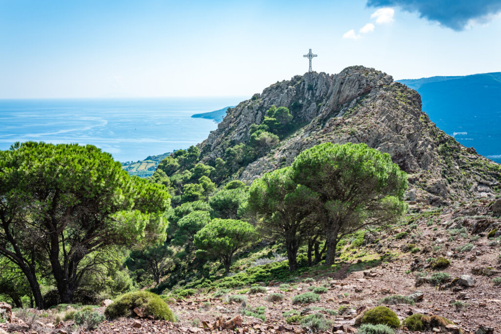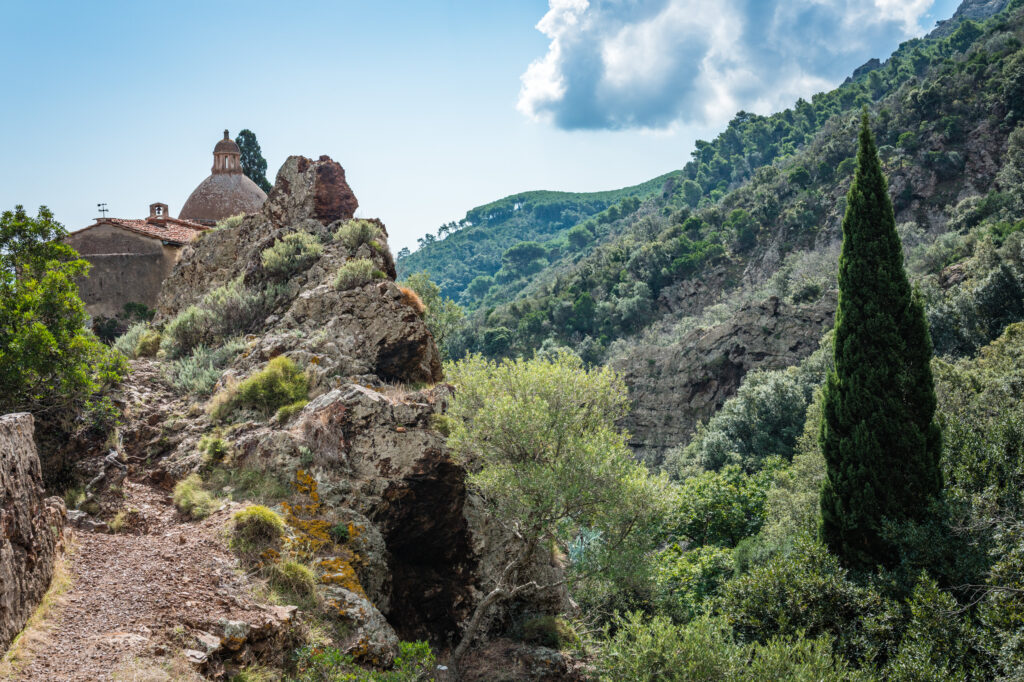 In der zweiten Woche (ich war inzwischen deutlich fitter) starteten wir eine Wanderung am „Santuario della Madonna di Montserrato“, einer Wallfahrtskirche, hinter der ein Klettersteig zum Monte Castello beginnt. Der Weg ist im unteren Teil schlecht markiert und durch Geröll erschwert. Ein Schild weist darauf hin, er sei für erfahrene Wanderer und meine Frau äusserte Zweifel, ob wir den nehmen sollten. Worauf ich (typisch für Testosteron) erwiderte, wenn wir nach 40 Jahren Wanderungen im Hochgebirge nicht zu „erfahrenen Wanderern“ zählten, wer das überhaupt sei?