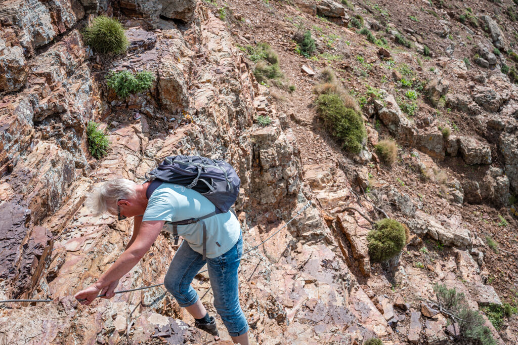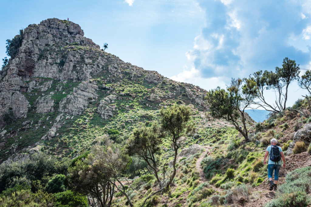 Wir bewältigten den Steig ohne Probleme und kamen an die Stelle, wo wir die Wanderung über den Hauptkamm in der Woche zuvor unterbrochen hatten. Dort kann man in unterschiedliche Richtungen weiterwandern. Um eine Runde zu machen, gingen wir dann Richtung des Monte della Croce oberhalb von Porto Azurro. Da gibt es ebenfalls einige Kletterstellen mit Stahlseilen an der Felswand. Das war sicher die „alpinste“ Wanderung, die wir gemacht haben. Unterhalb des Monte Croce führt ein (leichter) Weg wieder zum Ausgangspunkt.