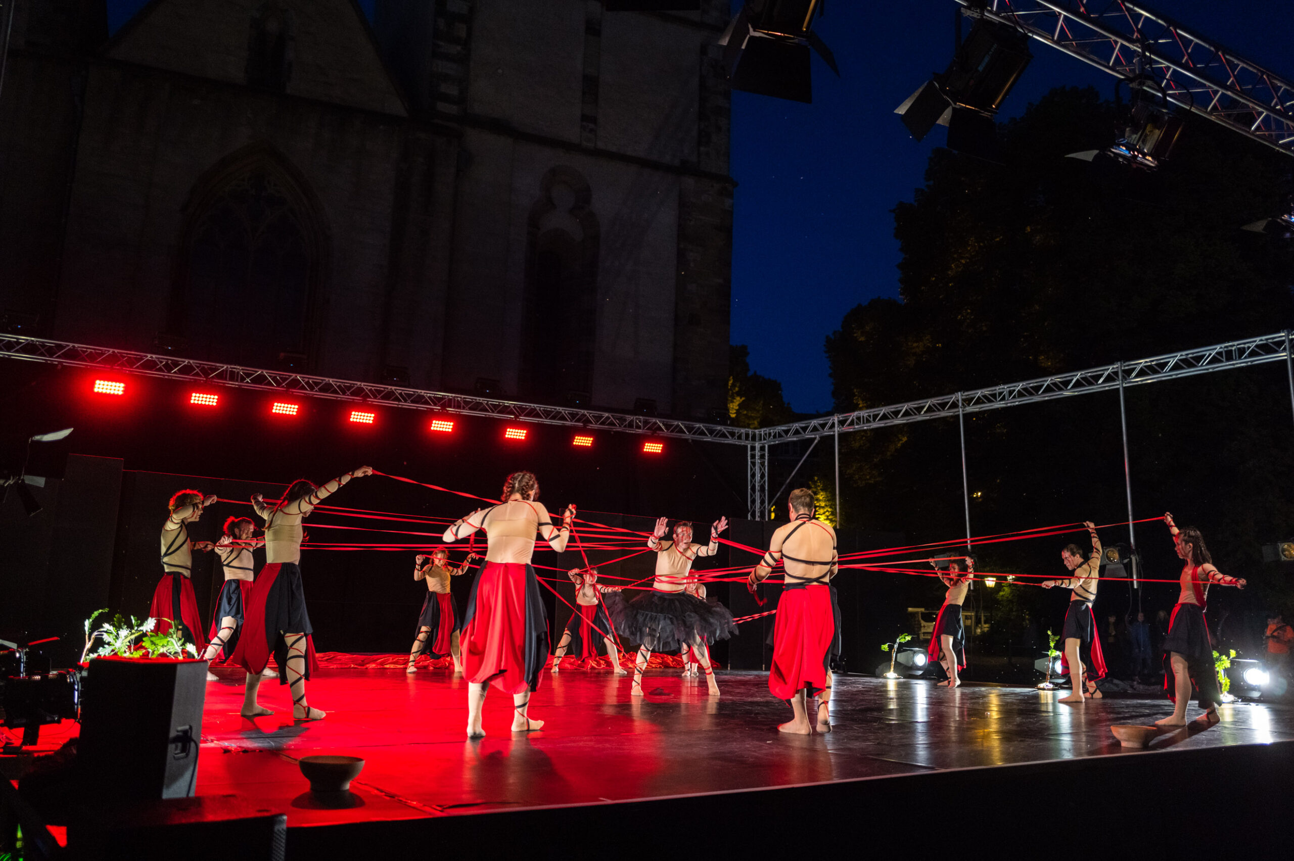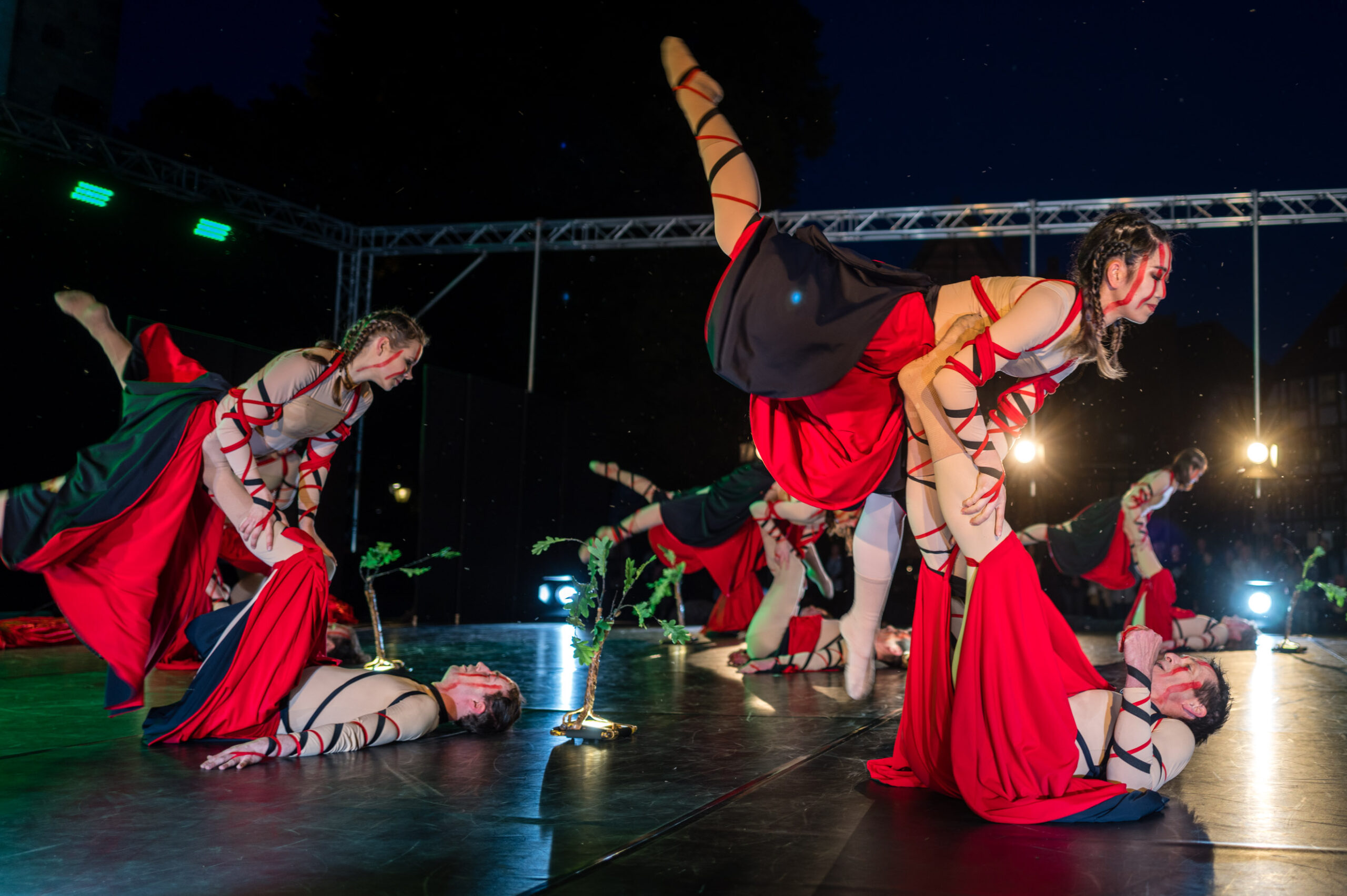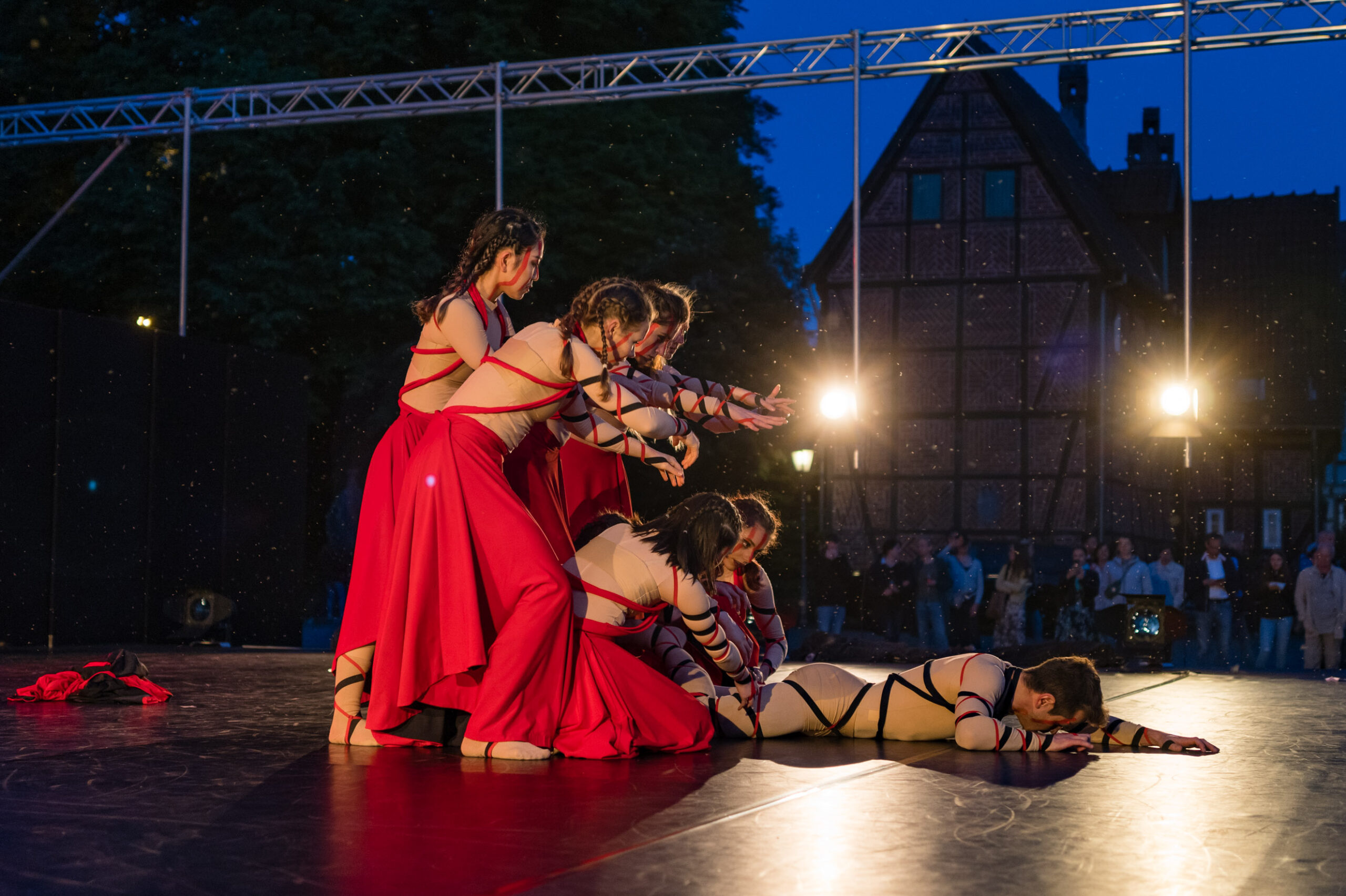 Ist ja schön und gut, sowas im stillen Kämmerlein zu testen, aber grottenlangweilig. Als die Q2 neu war, war zufällig gerade „Der Hermann leuchtet“ und das war gleich eine würdige „Challenge“ (bei der sie sich sehr gut behauptete). Der leuchtende Schwertheini war nun keine Option, aber in Herford war letzte Woche das „Hoeker-Fest“, ein Volksfest in der ganzen Innenstadt mit vielen Bühnen und Vorführungen. Dort machte ich mich am Freitag Abend auf die Suche nach Motiven, vorzugsweise bei Low-Light, aber da muss man Anfang Juni schon Geduld haben. Bis 22.00 Uhr zog mich auch nichts so richtig vom Hocker, aber dann begann auf dem Rathausplatz „open air“ die Ballett-Aufführung der „Deutschen Tanzcompanie“ nach Musik der „Carmina Burana“ von Carl Orff. Ein Hammerstück, die Musik sowieso. „O Fortuna“ ist Heavy-Metal für Chorsänger (wie mich).