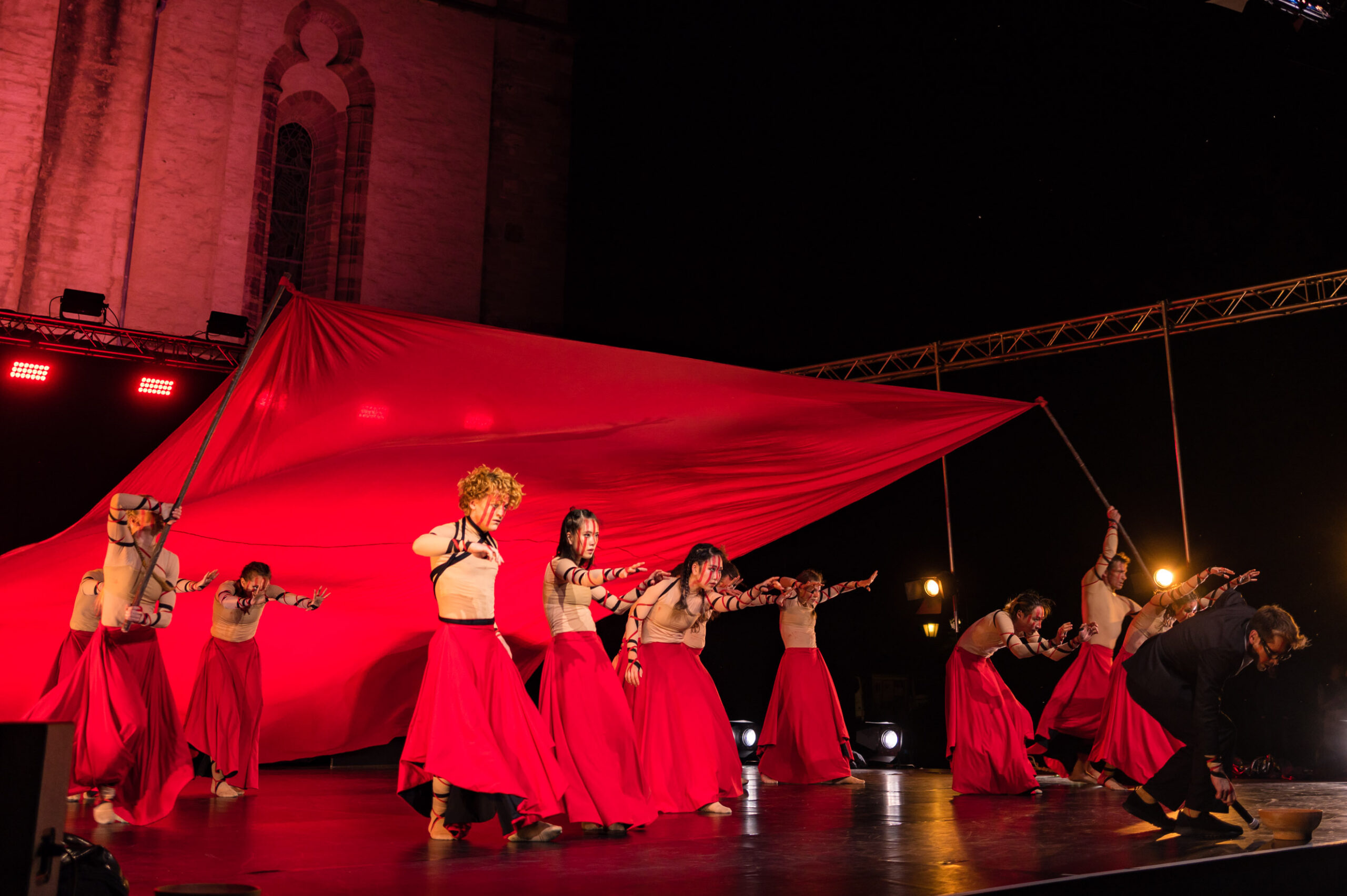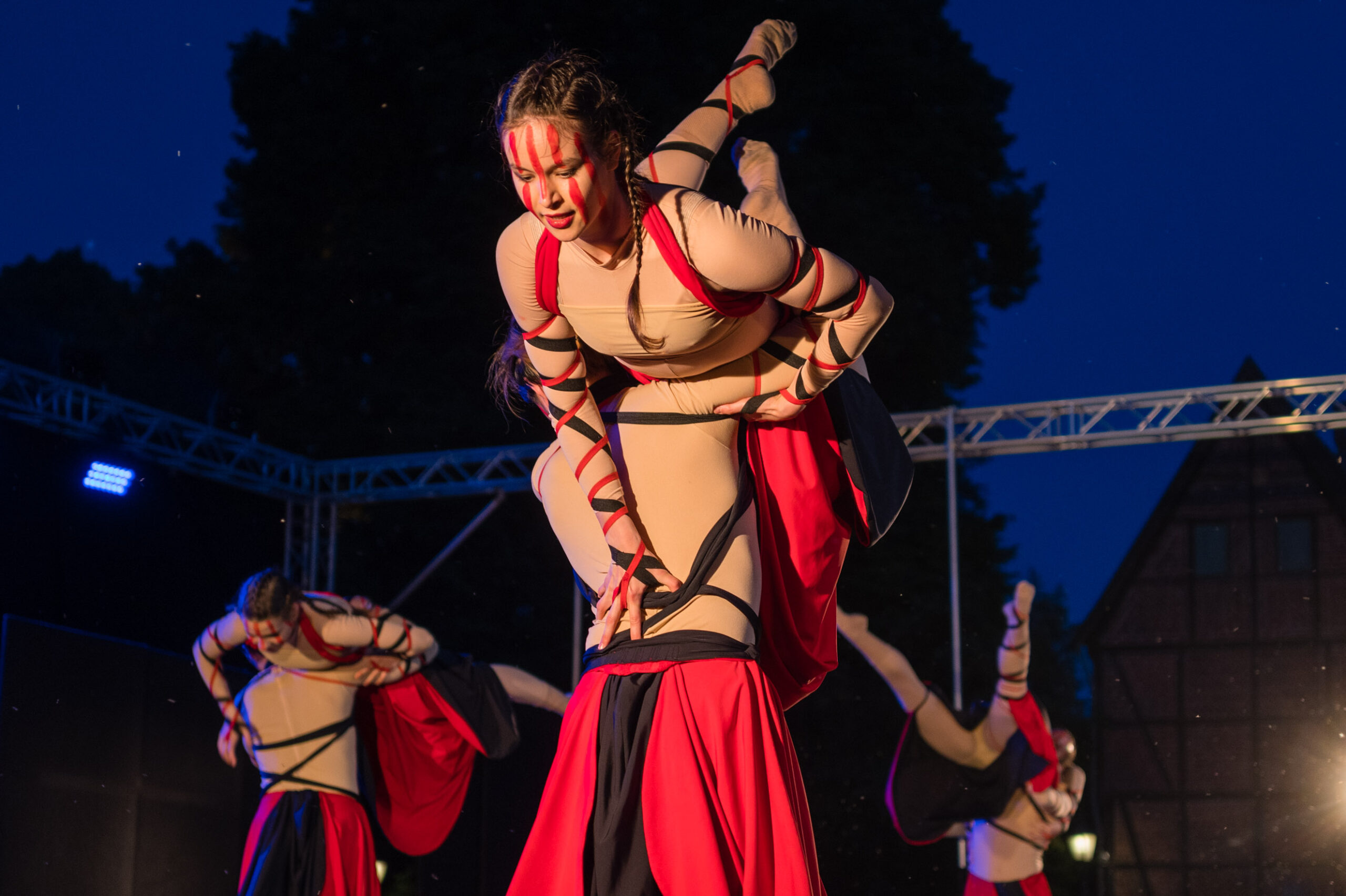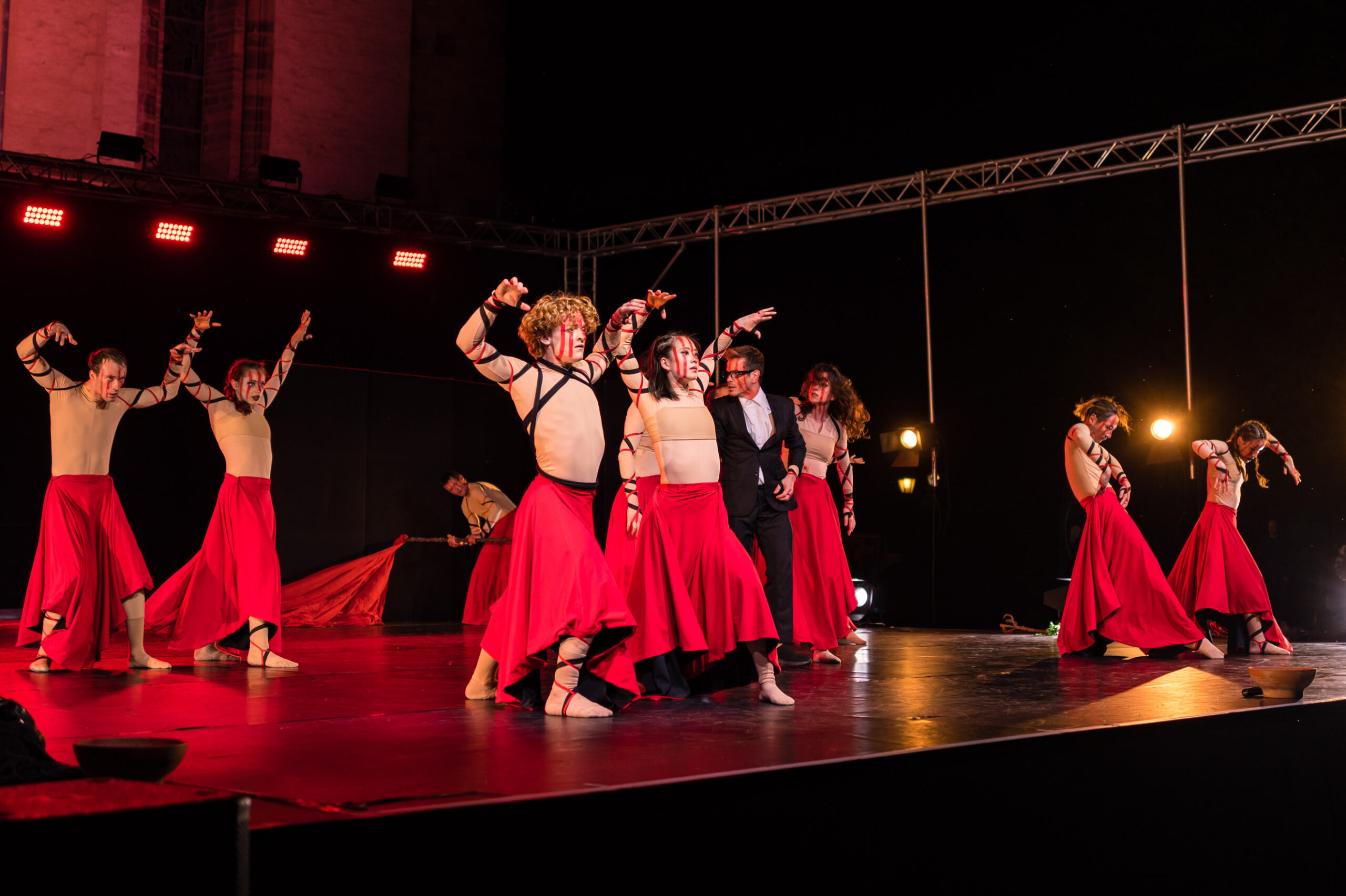 Ist ja schön und gut, sowas im stillen Kämmerlein zu testen, aber grottenlangweilig. Als die Q2 neu war, war zufällig gerade „Der Hermann leuchtet“ und das war gleich eine würdige „Challenge“ (bei der sie sich sehr gut behauptete). Der leuchtende Schwertheini war nun keine Option, aber in Herford war letzte Woche das „Hoeker-Fest“, ein Volksfest in der ganzen Innenstadt mit vielen Bühnen und Vorführungen. Dort machte ich mich am Freitag Abend auf die Suche nach Motiven, vorzugsweise bei Low-Light, aber da muss man Anfang Juni schon Geduld haben. Bis 22.00 Uhr zog mich auch nichts so richtig vom Hocker, aber dann begann auf dem Rathausplatz „open air“ die Ballett-Aufführung der „Deutschen Tanzcompanie“ nach Musik der „Carmina Burana“ von Carl Orff. Ein Hammerstück, die Musik sowieso. „O Fortuna“ ist Heavy-Metal für Chorsänger (wie mich).