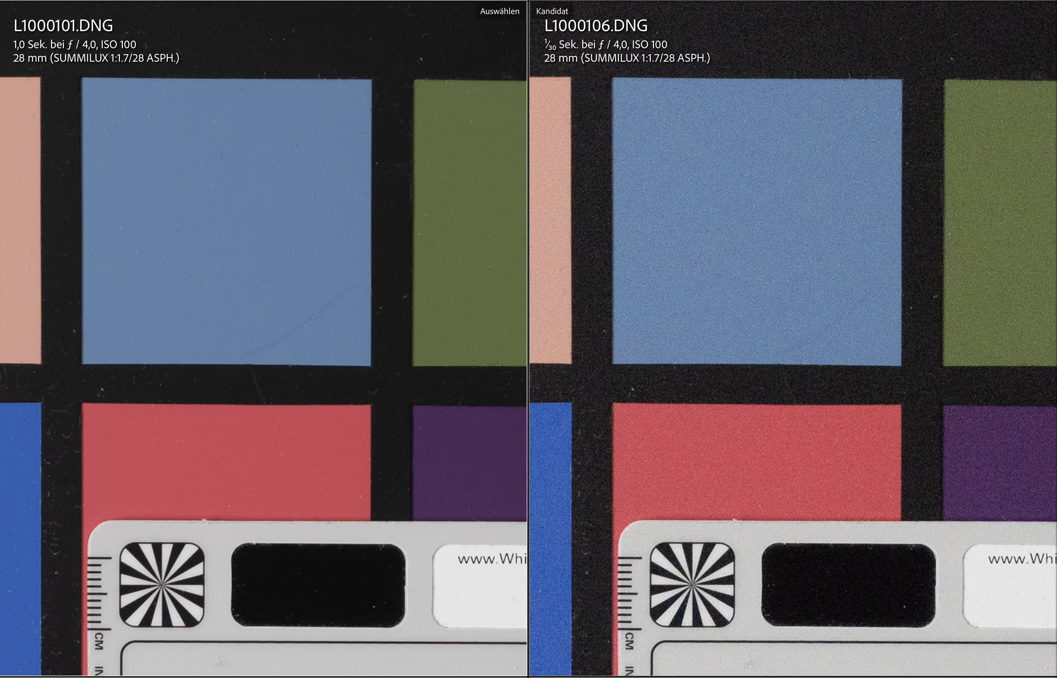 Der Test zeigte, dass der Sensor ein riesiges Potential in den Schatten hat und man darum lieber sparsam belichtet, um die wesentlich empfindlicheren Highlights zu erhalten. Die Schatten kann man holen, ohne sich nennenswert Rauschen einzufangen. Mit steigender ISO geht das natürlich verloren. Das Ergebnis hatte ich auch erwartet, denn es handelt sich vermutlich um einen ähnlichen Sensor wie bei der M11. Aber keine Q hatte jemals so ein Power-Paket hinter der Linse. Welche, nebenbei (siehe Siemensstern auf der Whibal-Karte im Bild oben), mit der Auflösung kein Problem hat und gewohnt gute Abbildungsqualität aufweist, wenn auch mit etwas Einsatz von Software (SDC=Software-Distortion-Correction), um die Baugröße zu ermöglichen. „Triple Resolution“ habe ich übrigens schon seit der M11 abgehakt. Es erzeugt keine Vorteile, mit niedrigeren Auflösungen zu arbeiten, ich bleibe immer bei L-DNG.