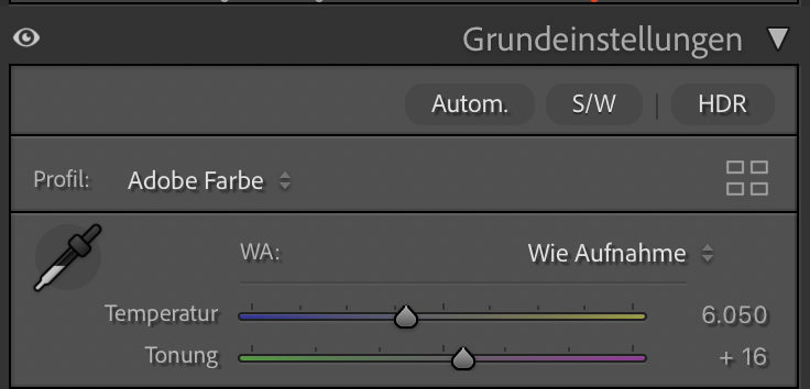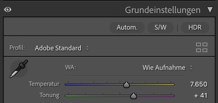 Der Wert für die Tönung (grün-cyan) war gleichermassen „off“ und ändert sich proportional. Was nicht geht: Man kann nicht einfach von „Adobe Standard“ auf ein anderes Farbprofil schalten, wenn man den Weissabgleich „benutzerdefiniert“ verändert hat. Dann werden die Zahlen 1:1 übernommen und der resultierende Weissabgleich ist natürlich völlig daneben.